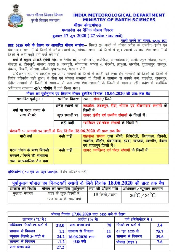 मौसम विभाग का कहना है कि जून में अब तक 75.7 मिलीमीटर बारिश हो चुकी है। जून महीने में मध्य प्रदेश के 38 से ज्यादा जिलों में बारिश दर्ज हुई है। भोपाल सिटी 7.6 मिली मीटर, सीधी 10.8 मिली मीटर, रायसेन 8.6 मिली मीटर,भोपाल 3.4 मिली मीटर, होशंगाबाद 5.6 मिली मीटर, इंदौर 1.9 मिली मीटर, रतलाम 19 मिली मीटर बारिश दर्ज हुई है।