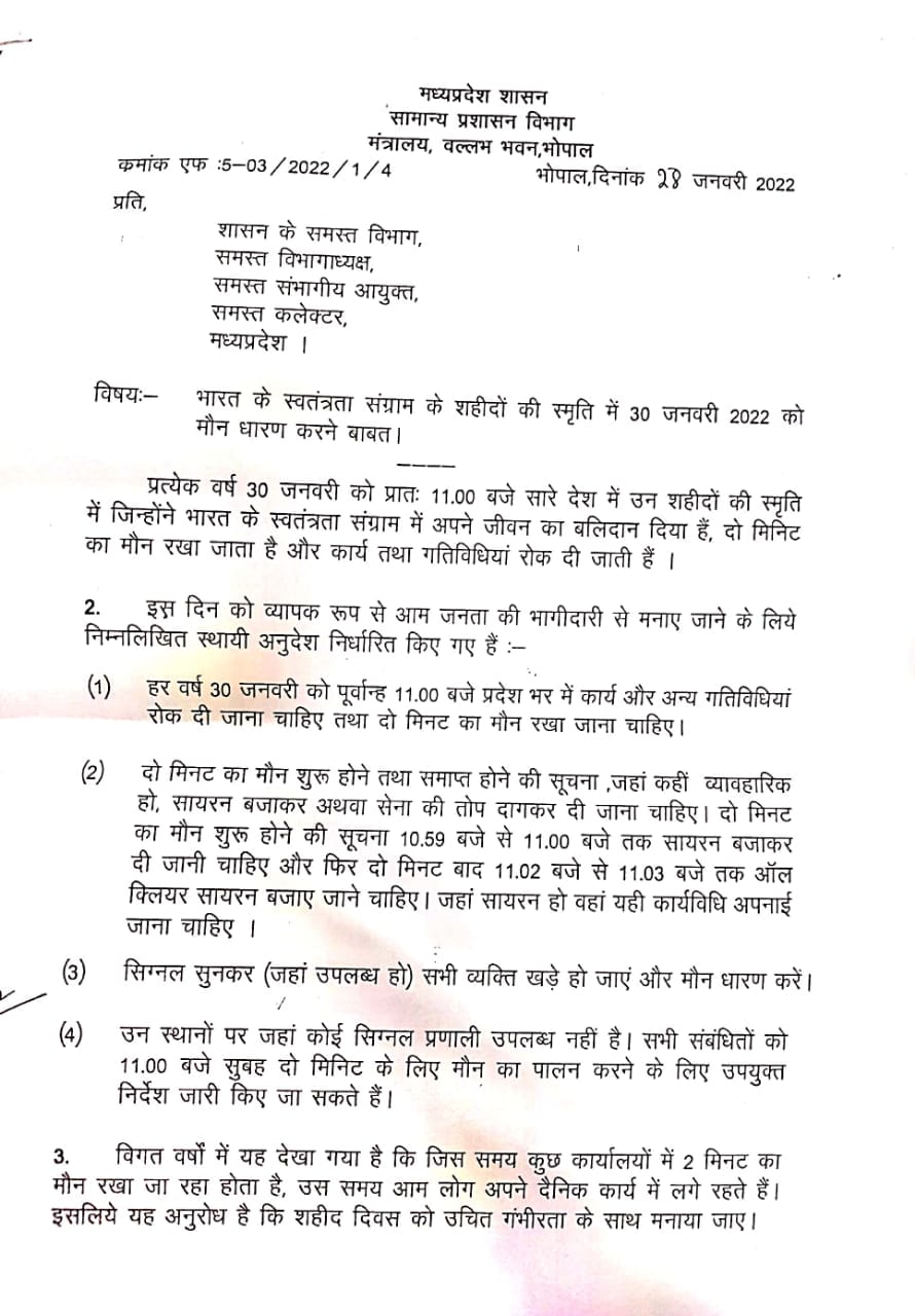 भोपाल, डेस्क रिपोर्ट। मध्य प्रदेश सरकार (Madhya Pradesh Government) ने भारत की आजादी के लिए अपने प्राणों का बलिदान करने वाले शहीदों की याद में 30 जनवरी “शहीदी दिवस” पर सुबह 11 बजे दो मिनट का मौन रखने का आदेश जारी किया है। सरकार के सामान्य प्रशासन विभाग ने इसके लिए आदेश निकाल कर सभी विभागाध्यक्षों, संभागीय आयुक्त और कलेक्टर को अपने अपने कार्यालयों में दो मिनट का मौन रखने के निर्देश जारी किए हैं। लेकिन पत्र में महात्मा गांधी का नाम नहीं होने पर कांग्रेस ने आपत्ति जताई है और भाजपा पर हमला किया है।