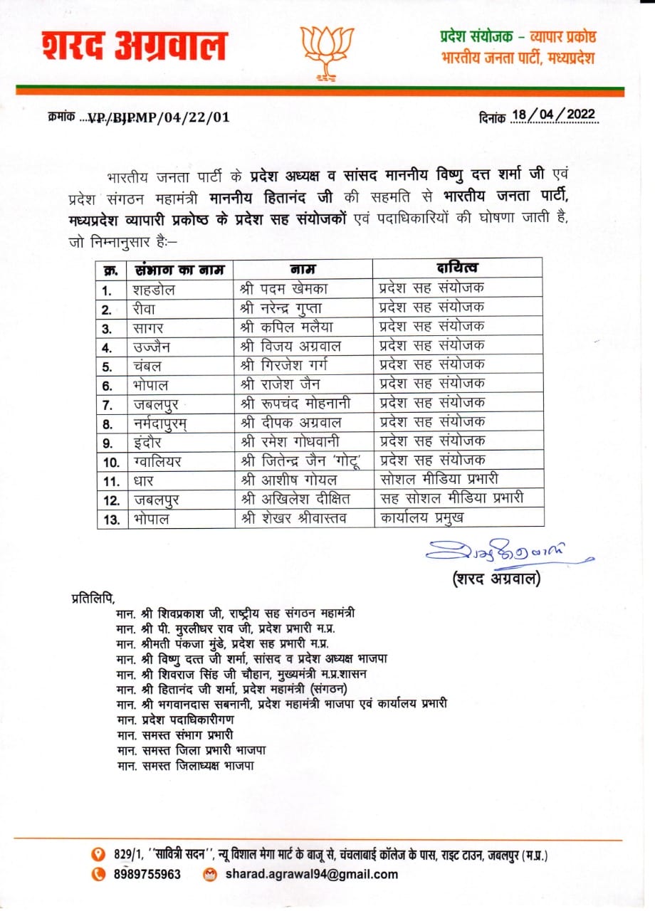 भाजपा व्यापार प्रकोष्ठ (BJP Business Cell) के प्रदेश संयोजक शरद अग्रवाल ने भाजपा प्रदेश अध्यक्ष विष्णु दत्त शर्मा (BJP State President VD Sharma) एवं प्रदेश संगठन महामंत्री हितानंद (Hitanand) की सहमति से मध्य प्रदेश (MP News) के संभागों में प्रदेश सह संयोजकों की नियुक्ति की हैं। सूची इस प्रकार है।