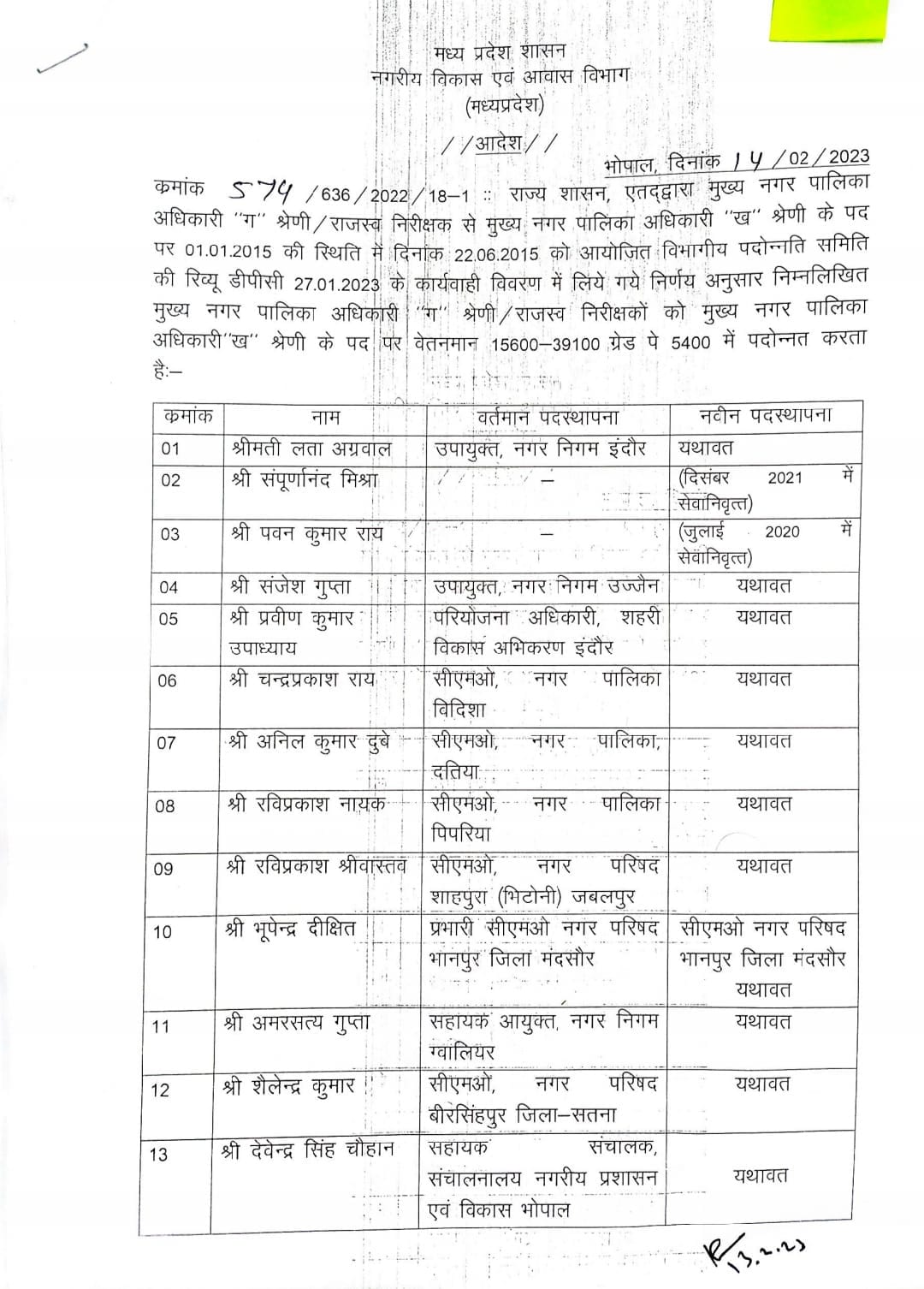 MP Promotion 2023 : मध्य प्रदेश शासन के नगरीय विकास एवं आवास विभाग (MP Urban Development and Housing Department) के अंतर्गत आने वाले मुख्य नगर पालिका अधिकारियों/ राजस्व निरीक्षकों को शासन ने पदोन्नत किया है, विभाग द्वारा जारी आदेश में कहा गया है कि पदोन्नति समिति की रिव्यू डीपीसी 27 जनवरी 2023 के कार्यवाही विवरण में लिए गए निर्णय के अनुसार मुख्य नगर पालिका अधिकारी “ग” श्रेणी/राजस्व निरीक्षकों को मुख्य नगर पालिका अधिकारी “ख” श्रेणी के पद पर वेतनमान 15600 – 39100 ग्रेड पे 5400 में पदोन्नत करता है।