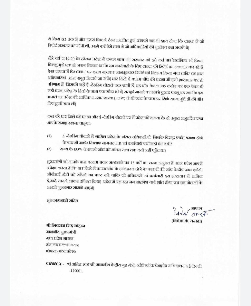 भोपाल, डेस्क रिपोर्ट। राज्यसभा सांसद विवेक तंखा ने मुख्यमंत्री शिवराज सिंह चौहान को पत्र लिखा है सांसद तंखा ने मध्यप्रदेश के धार जिले में कारम बांध के क्षतिग्रस्त होने एवं ई टेंडरिंग घोटाले के कारणों की संयुक्त जांच केंद्रीय जांच एजेंसी सीबीआई / ईडी से करवाने का अनुरोध किया है। तंखा ने अपने पत्र में लिखा है कि यह चिंताजनक है कि प्रदेश के धार जिले में कारम नदी पर 304.44 करोड़ के प्रोजेक्ट वाला बांध आखिरकार बारिश क्यों नही संभाल पाया, इस क्षेत्र के बांध से क्षेत्र के 50 गांवों के किसानों को काफी उम्मीदें थीं, लेकिन इस बांध ने लोगो का काफी नुकसान कर दिया। विवेक तंखा ने लिखा कि प्रदेश जानता है कि विगत कुछ वर्षो के दौरान मध्यप्रदेश में ई टेंडर में हस्तक्षेप के माध्यम से टेंडर में छेड़छाड़ की एक परंपरा रही है, इसके बारे में सर्वप्रथम जानकारी तब सामने आई जब भारत की एक विश्व स्तर की प्रसिद्ध कंपनी जो आधारभूत संरचना और निर्माण के क्षेत्र में अग्रणी है जिसने पूर्व में भी शासन द्वारा जारी किए गए ई टेंडर की प्रक्रिया में हिस्सा लिया था किंतु असफल रहने पर जब इसके कारणों की जांच कराई तो ई टेंडर प्रक्रिया में त्रुटि सामने आई, कंपनी ने इस बारे में विभाग से जुड़े वरिष्ठ अधिकारियों को भी अवगत कराया था।