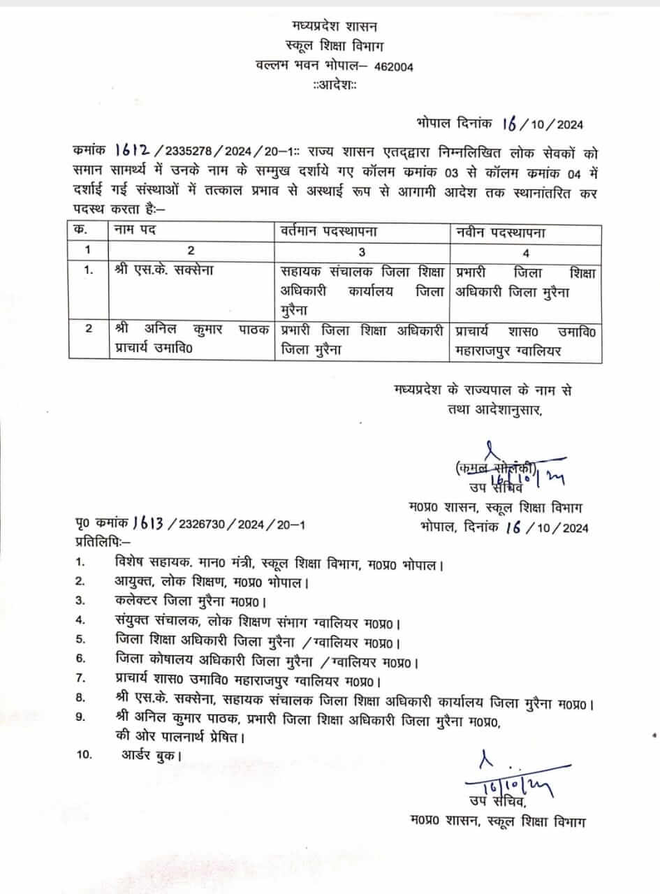 स्कूल  शिक्षा विभाग द्वारा जारी आदेश के तहत जिला शिक्षा अधिकारी कार्यालय मुरैना में पदस्थ सहायक संचालक एस के सक्सेना को प्रभारी जिला शिक्षा अधिकारी नियुक्त किया गया है वहीं उच्चतर माध्यमिक विद्यालय के प्राचार्य प्रभारी जिला शिक्षा अधिकारी मुरैना अनिल कुमार पाठक को प्राचार्य शासकीय उच्चतर माध्यमिक विधायाली महाराजपुरा ग्वालियर पदस्थ किया गया है।