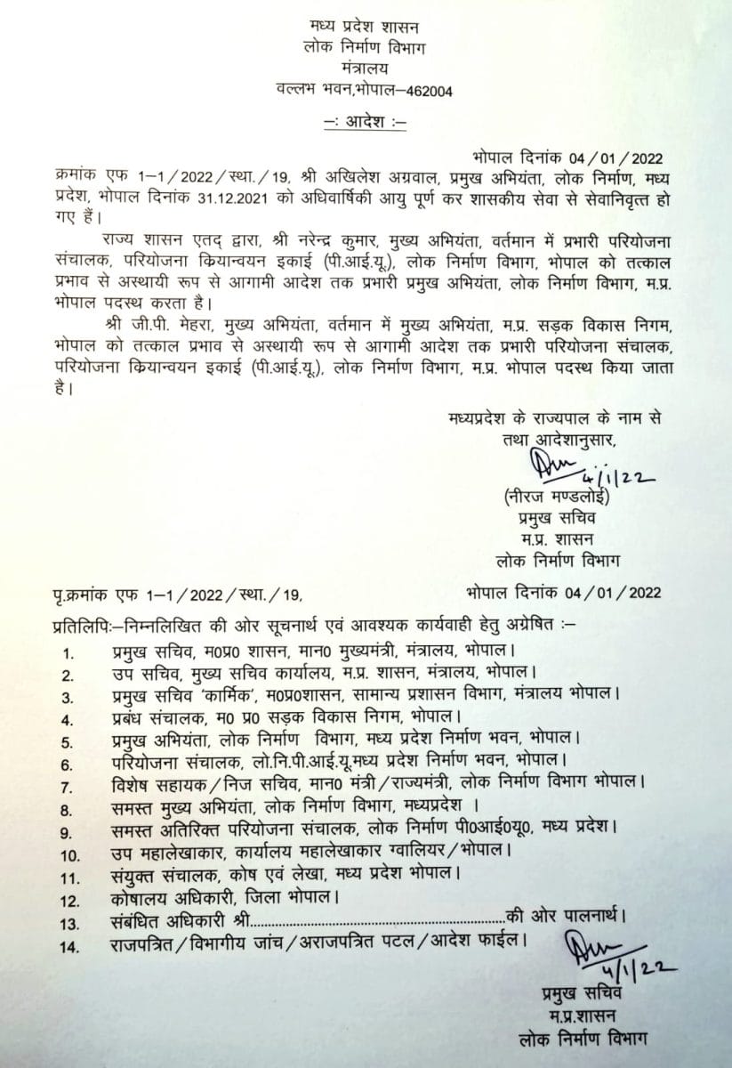 भोपाल, डेस्क रिपोर्ट। राज्य शासन ने आज मंगलवार को एक आदेश जारी कर लोक निर्माण विभाग में फेरबदल(MP Transfer) किया है। आदेश के अनुसार लोक निर्माण विभाग के प्रमुख अभियंता अखिलेश अग्रवाल 31 दिसंबर 2021 को सेवानिवृत हो गए हैं। उनके स्थान पर अब मुख्य अभियंता लोक निर्माण विभाग नरेंद्र कुमार को आगामी आदेश तक ये जिम्मेदारी सौंपी गई है।