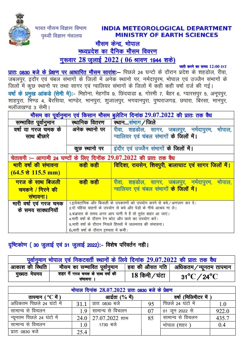 इस बीच भारत मौसम विभाग (IMD) ने आज अपनी दैनिक रिपोर्ट जारी की जिसमें बहुत से स्थानों पर भारी बारिश की चेतावनी दी गई है। एमपी मौसम विभाग ने दैनिक रिपोर्ट (MP Weather Daily Report) जारी करते हुए प्रदेश के 46 जिलों में येलो अलर्ट जारी किया है। मौसम विभाग (MP Weather Forecast) ने विदिशा, रायसेन, शिवपुरी, बालाघाट और सागर जिलों में कहीं कहीं भारी बारिश की सम्भावना जताते हुए येलो अलर्ट (MP Weather Yellow Alert) जारी किया है।