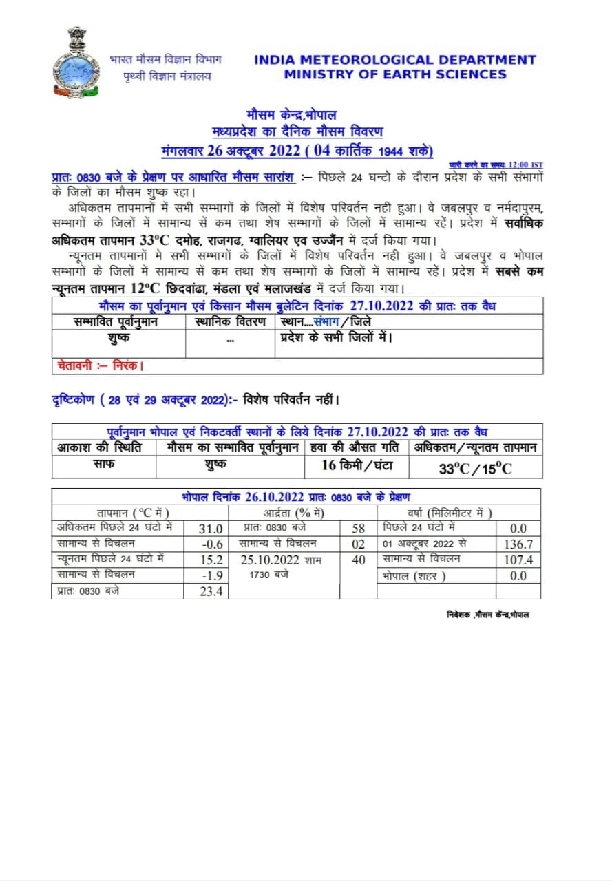एमपी मौसम विभाग ने अपनी दैनिक रिपोर्ट (MP Weather Daily Report, ) में प्रदेश के पिछले 24 घंटे के मौसम का हाल बताया है और आने वाले 24 घंटे का पूर्वानुमान भी जारी किया है। मौसम विभाग के मुताबिक पिछले 24 घंटों में प्रदेश के सभी जिलों का मौसम शुष्क रहा। सभी संभागों के जिलों के अधिकतम तापमान में कोई विशेष परिवर्तन नहीं हुआ।