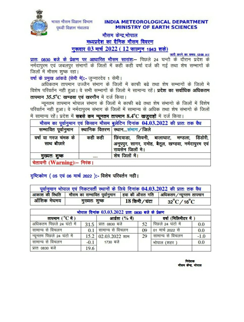 एमपी मौसम विभाग (MP Weather Department) द्वारा आज 03 मार्च 2022 को जारी रिपोर्ट के मुताबिक प्रदेश के छिंदवाड़ा, सिवनी, बालाघाट, मंडला, डिंडोरी, अनूपपुर, सागर, दमोह, बैतूल, खंडवा, नर्मदापुरम और रायसेन जिलों में कहीं कहीं वर्षा या गरज चमक के साथ बौछारें पड़ने के आसार हैं।