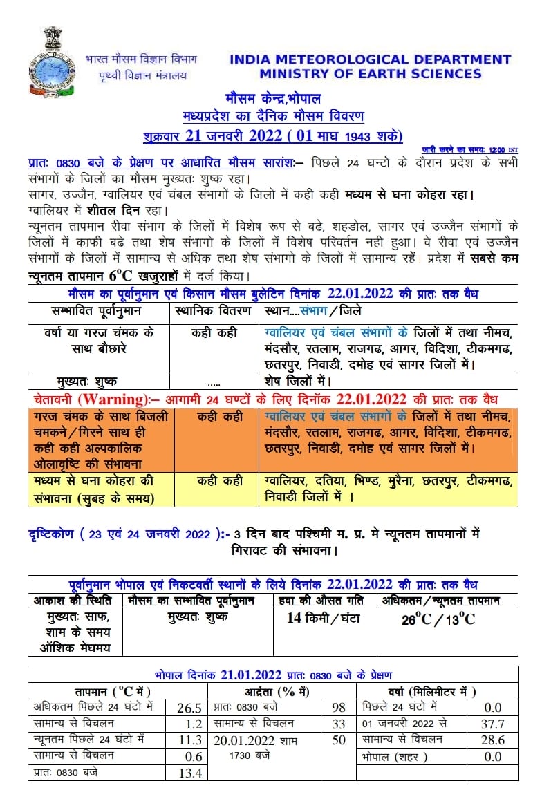 मौसम विभाग (MP Weather Forecast) के मुताबिक पिछले चौबीस घंटों में सागर, उज्जैन, ग्वालियर संभाग के जिलों में कहीं कहीं माध्यम से घना कोहरा (Heavy Fog) रहा। वहीं ग्वालियर जिले में शीतल दिन (कोल्ड cold day) रहा। सबसे कम न्यूनतम तापमान खजुराहो में 6 डिग्री सेल्सियस दर्ज किया गया।