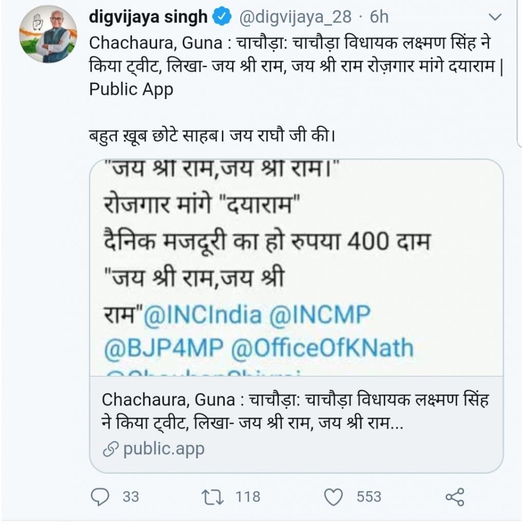 भोपाल। “जय श्री राम,जय श्री राम।” रोजगार मांगे “दयाराम” दैनिक मजदूरी का हो रुपया 400 दाम “जय श्री राम,जय श्री राम।” चाचौड़ा विधायक लक्ष्मण सिंह (Lakshman Singh) का या ट्वीट एक बार फिर चर्चा में आ गया है। बता दें कि इसके पहले लक्ष्मण सिंह के बड़े भाई और पूर्व मुख्यमंत्री दिग्विजय सिंह (Digvijay Singh) भी राम को लेकर ऐसी ही टिप्पणी कर चुके हैं, जिसमे उन्होंने तत्कालीन बीजेपी मंत्री राघव जी को निशाना बनाते हुए कहा था बच्चा बच्चा राम का, राघव जी के काम का।