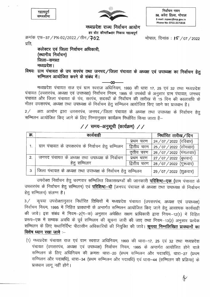 इसी तरह जनपद पंचायत के अध्यक्ष तथा उपाध्यक्ष के निर्वाचन के लिए प्रथम चरण 27 जुलाई और द्वितीय चरण के लिए 28 जुलाई 2022 को सम्मिलन होगा। जिला पंचायत के अध्यक्ष तथा उपाध्यक्ष के निर्वाचन के लिए 29 जुलाई 2022 को सम्मिलन होगा।