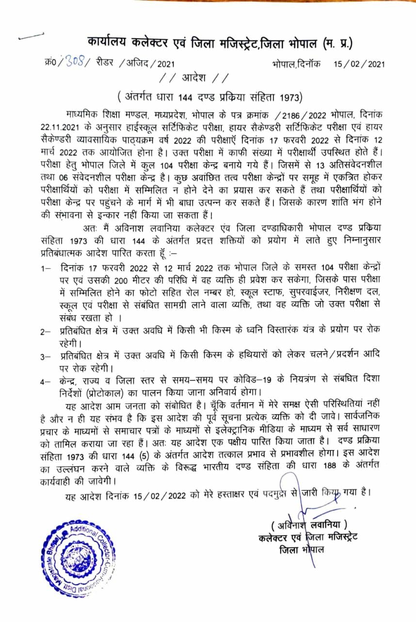भोपाल, डेस्क रिपोर्ट। भोपाल में 17 फरवरी से शुरू होने जा रही माध्यमिक शिक्षा मण्डल की 10वीं औऱ 12वीं की बोर्ड परीक्षा को लेकर धारा 144 लागू कर दी गई है, कलेक्टर भोपाल अविनाश लवानिया ने आदेश जारी किया है धारा-144 शहर में 17 फरवरी से 12 मार्च तक लागू रहेगी , वही अब किसी भी प्रकार का ध्वनि विस्तारक यंत्र अगर बजाया तो कार्यवाही होगी, इन परीक्षा केंद्र के आसपास हथियार और किसी भी तरह के प्रदर्शन पर रोक लगा दी गई है, बोर्ड परीक्षा के लिए भोपाल में कुल 104 परीक्षा केंद्र बनाए गए है, जिनमें कुल 104 में से 13 अतिसंवेदनशील औऱ 6 सवेंदनशील सेंटर बनाए गए है।