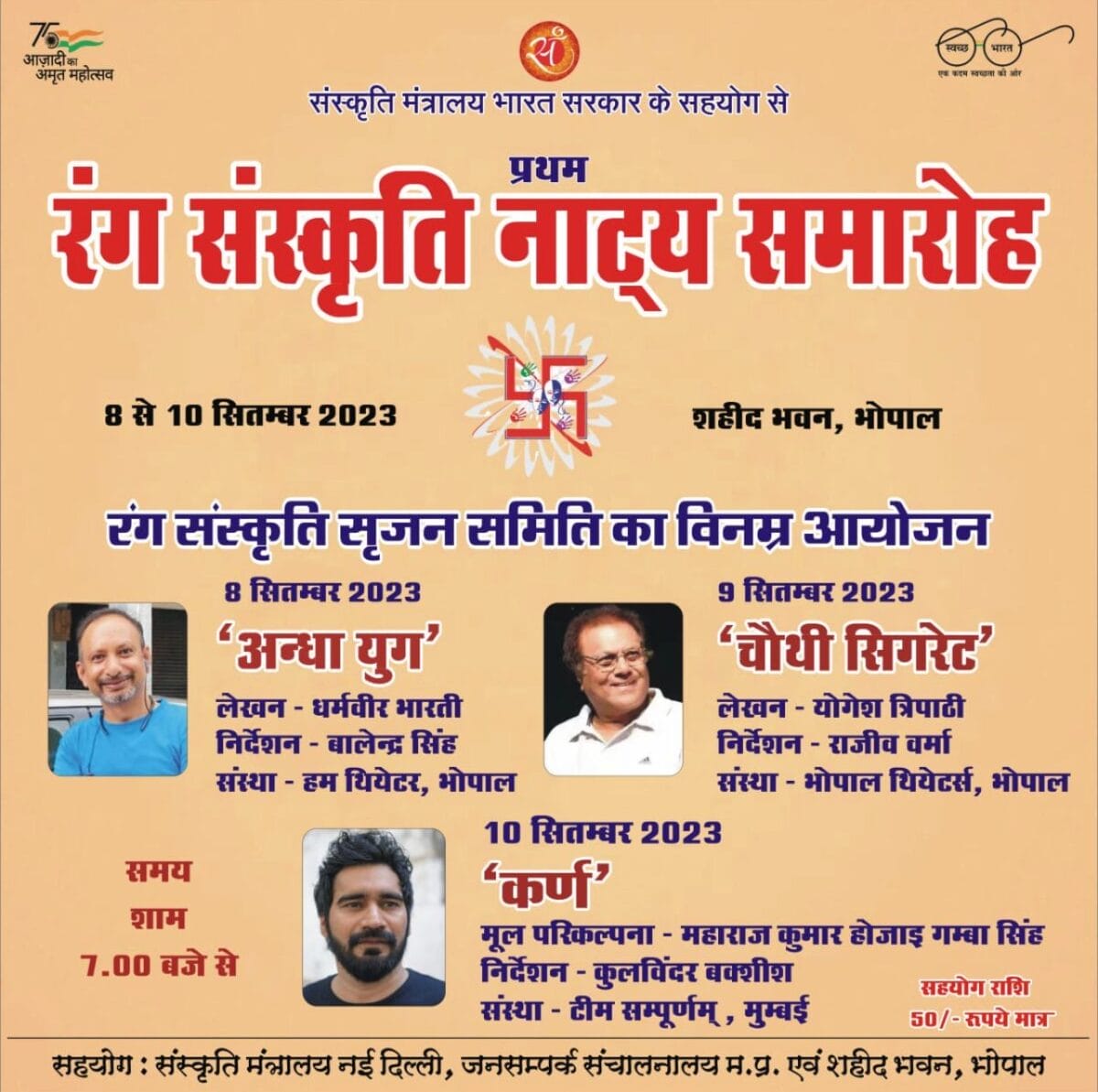 सम्मान समारोह के बाद पहले दिन की प्रस्तुति के रूप में बालेंद्र सिंह निर्देशित एवं धर्मवीर भारती द्वारा लिखित हम थिएटर समूह के कलाकारों द्वारा नाटक ‘अंधा युग‘ का मंचन होगा। शहर के रंगप्रेमी दर्शक जो 3 सितंबर को रवीन्द्र भवन में मंचित इस प्रस्तुति को किसी कारण से नहीं देख पाए, उनके लिए भी धर्मवीर भारती की इस कालजयी रचना को मंच पर फिर अभिनीत होते देखने का अवसर होगा। दूसरे दिन सुप्रसिद्ध अभिनेता एवं रंगकर्मी राजीव वर्मा द्वारा निर्देशित एवं योगेश त्रिपाठी लिखित चर्चित नाटक ‘चौथी सिगरेट‘ का मंचन भोपाल थियेटर्स के कलाकारों द्वारा होगा। अंतिम दिवस संस्था टीम संपूर्णम मुंबई द्वारा कुलविंदर बख्शीश के निर्देशन में नाटक ‘कर्ण‘ का मंचन किया जाएगा। शुभारंभ दिवस पर कार्यक्रम 6ः30 पर आरम्भ होगा पश्चात नाटकों की प्रस्तुति प्रतिदिन शाम 7 बजे से होगी।