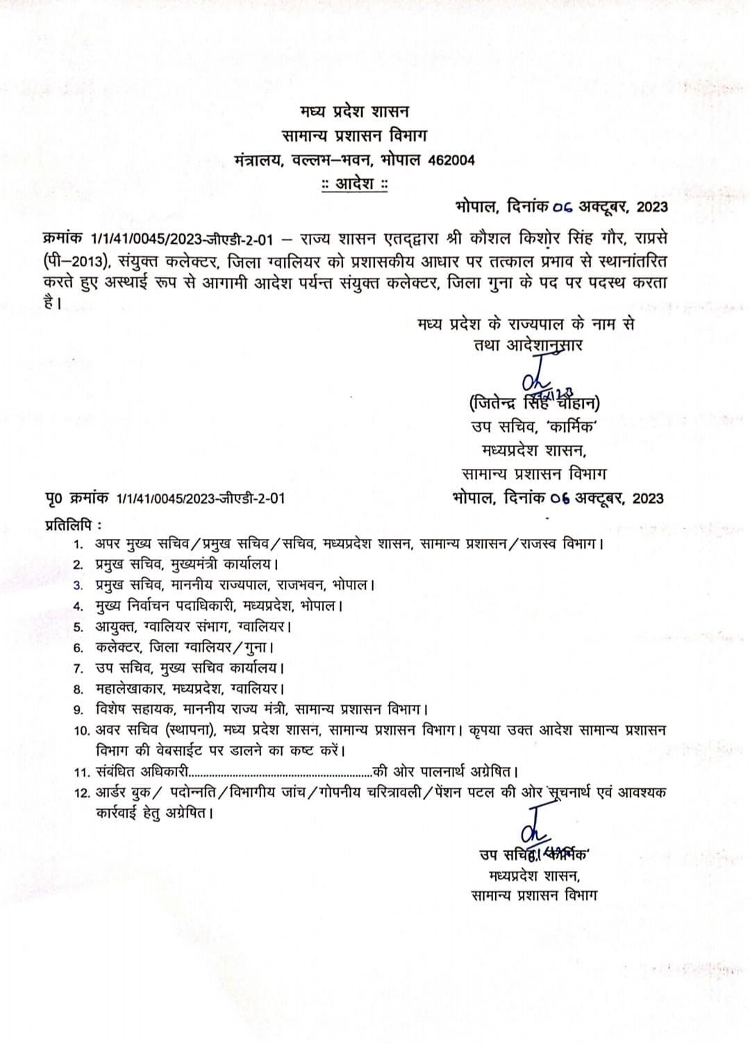 - कौशल किशोर सिंह गौर संयुक्त कलेक्टर ग्वालियर को संयुक्त कलेक्टर गुना