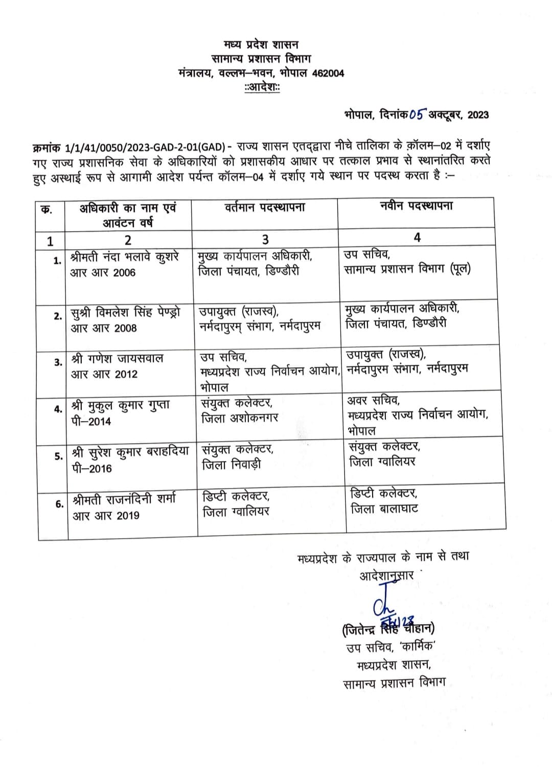 सामान्य प्रशासन विभाग मप्र शासन द्वारा दो सूची जारी की गई है एक सूची में 6 अधिकारियों के नाम हैं जबकि एक अन्य सूची में एक अधिकारी का नाम है जिन्हें एक एक स्थान से तबादला कर नई जगह पदस्थ किया है।