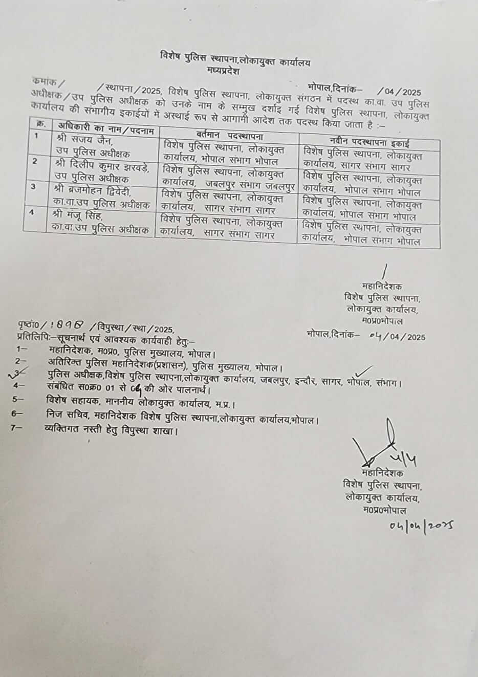 आदेश के तहत लोकायुक्त कार्यालय भोपाल संभाग में पदस्थ DSP संजय जैन को सागर संभाग भेजा गया है, जबलपुर संभाग में पदस्थ डीएसपी दिलीप कुमार झरवडे को भोपाल संभाग, सागर संभाग में पदस्थ कार्यवाहक उप पुलिस अधीक्षक बृजमोहन द्विवेदी को भोपाल संभाग और सागर संभाग में ही पदस्थ कार्यवाहक उप पुलिस अधीक्षक मंजू सिंह को भी भोपाल संभाग पदस्थ किया है।