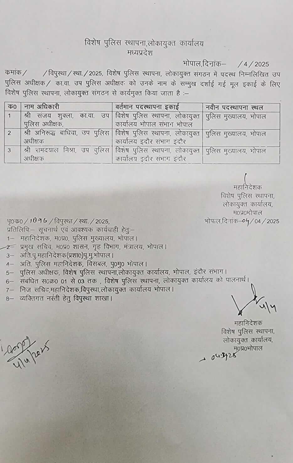 एक अन्य आदेश में तीन डीएसपी के नाम हैं जिनमें लोकायुक्त कार्यालय भोपाल संभाग में पदस्थ कार्यवाहक उप पुलिस अधीक्षक संजय शुक्ला, इंदौर संभाग में पदस्थ डीएसपी अनुराग बाधिया और इंदौर में ही पदस्थ डीएसपी रामदयाल मिश्रा को उनके मूल विभाग में वापस भेजने के लिए पुलिस मुख्यालय पदस्थ किया है।