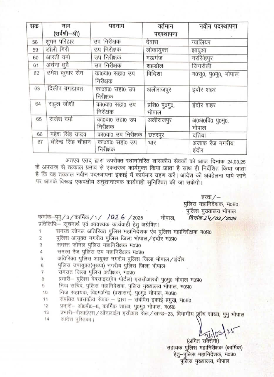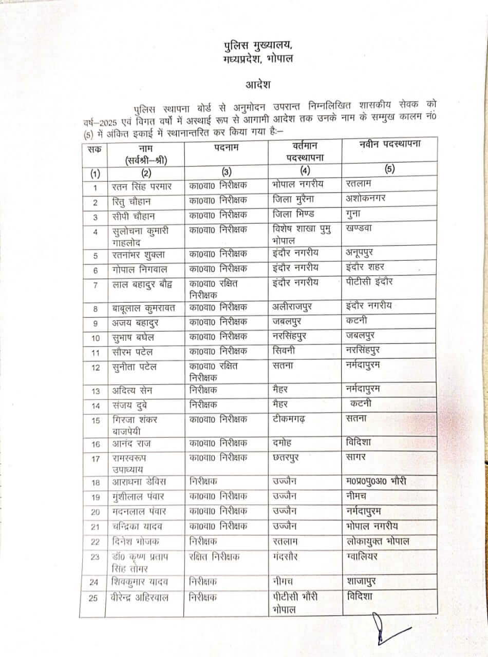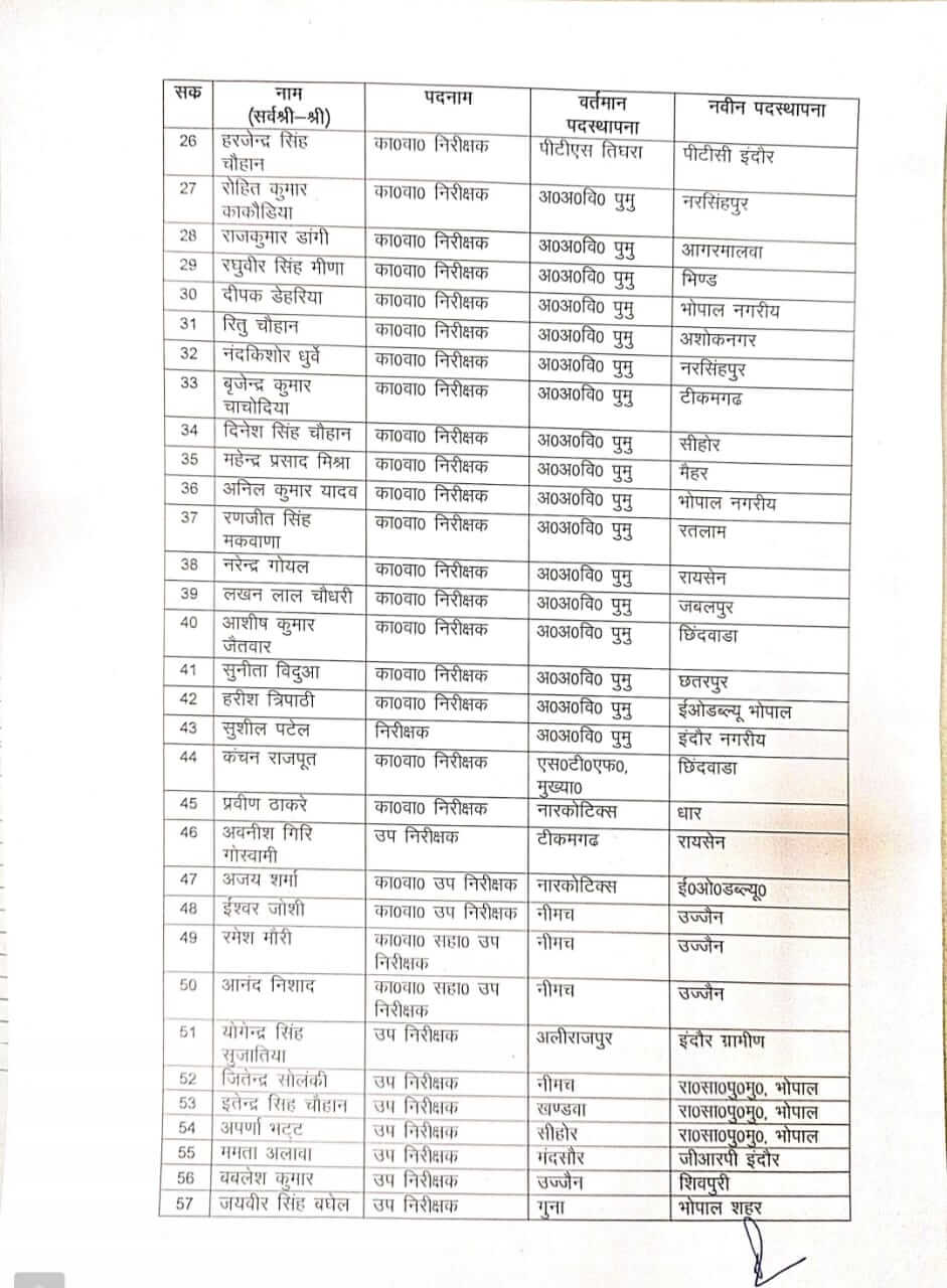 तबादला सूची में 67 पुलिस अधिकारियों के नाम हैं जिन्हें पुलिस स्थापना बोर्ड के अननुमोदन के बाद एक जिले से दूसरे जिले में ट्रांसफर किया गया है और तत्काल ट्रांसफर किये गए जिले में आमद देने के निर्देश दिए गए हैं, साथ ही चेतावनी गई है कि यदि ज्वाइन नहीं किया तो एकपक्षीय अनुशासनात्मक कार्यवाही की जाएगी।