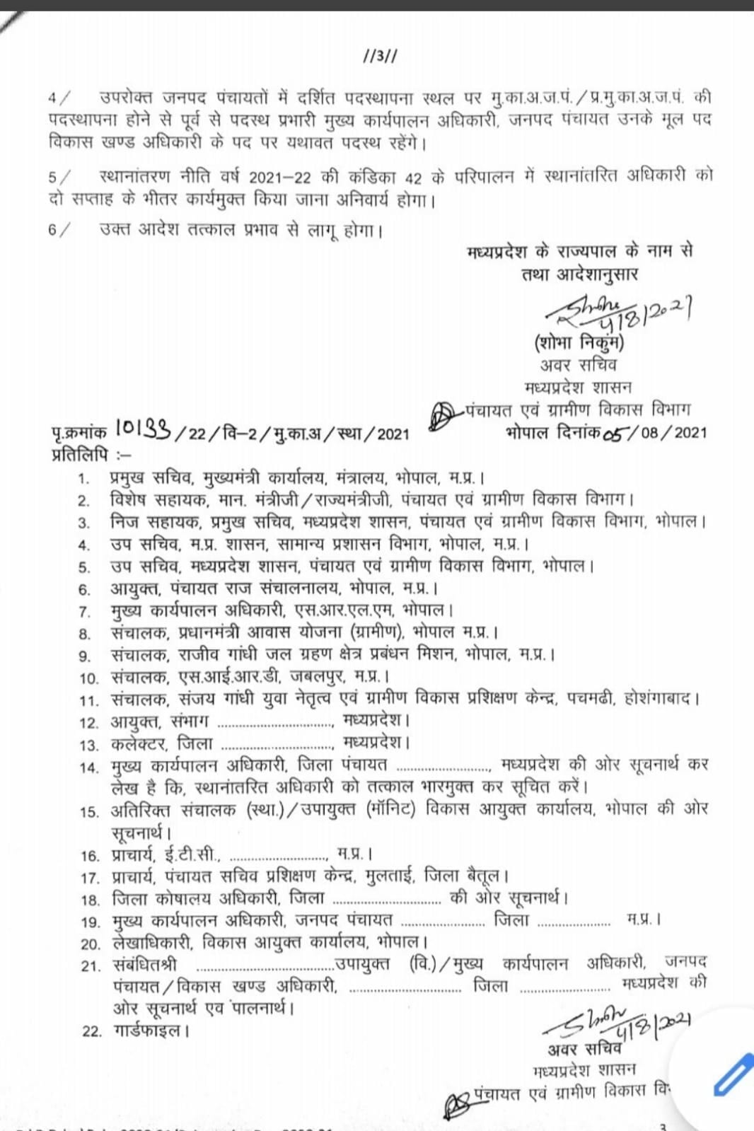 बता दे कि मुख्यमंत्री शिवराज सिंह चौहान (Chief Minister Shivraj Singh Chouhan) ने 6 अगस्त शुक्रवार को बाढ़ और वर्तमान परिस्थितयों को देखते हुए 15 अगस्त 2021 तक तबादलों पर रोक लगा दी है। इसके पहले 5 अगस्त तक हर विभाग में तबाड़तोड़ तबादले (Transfer) किए गए है, जिनकी लिस्ट एक के बाद एक सामने आ रही है।