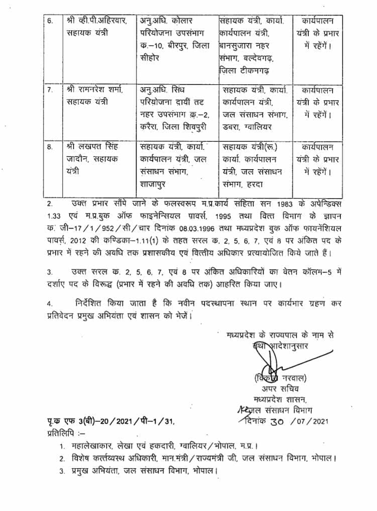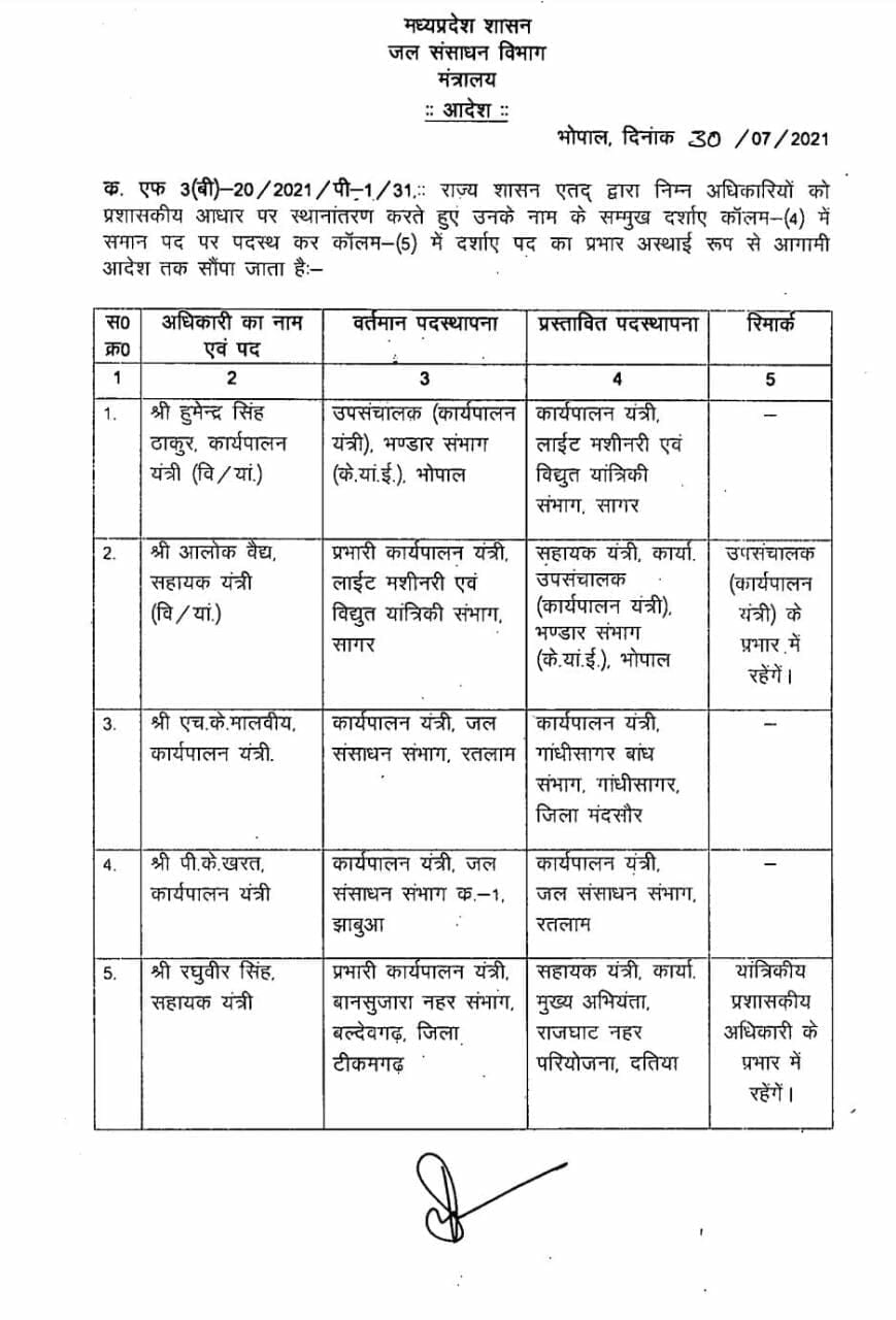 भोपाल, डेस्क रिपोर्ट। जल संसाधन विभाग में अधिकारियों के तबादले हुए हैं। इसे लेकर आदेश जारी कर दिया गया है। लिस्ट देखिये यहां-