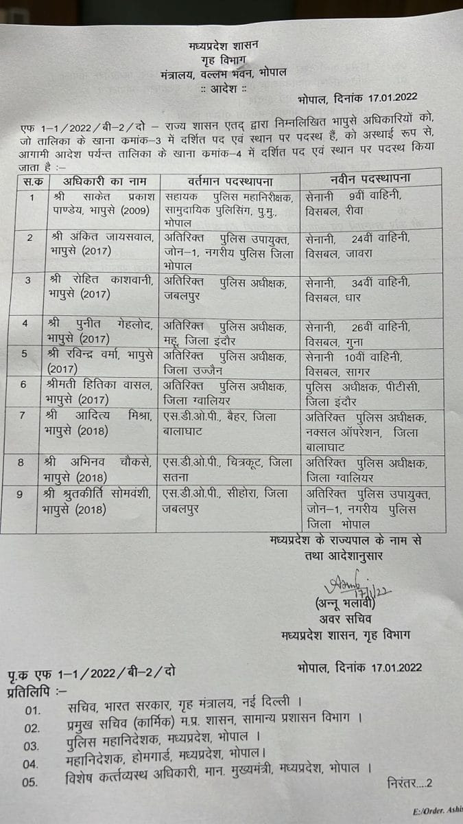 भोपाल, डेस्क रिपोर्ट। मध्य प्रदेश में तबादलों (MP Transfer) का दौर जारी है। लगातार प्रदेश के विभिन्न विभागों में तबादले हो रहे हैं। आज सोमवार को गृह विभाग ने आईपीएस अफसर (IPS Transfer) की ट्रांसफर लिस्ट (Transfer List) जारी की है। सूची में 9 IPS अधिकारियों को इधर से उधर किया गया है।