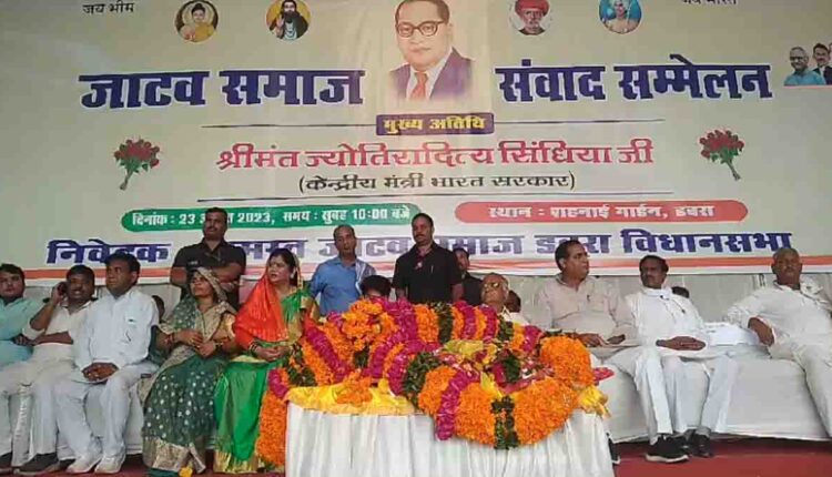 Dabra News : मध्य प्रदेश में चुनावी बिगुल बज चुका है प्रदेश के हर एक शहर में चुनावी आगाज हो चुका है वहीं बीजेपी के दिग्गज नेता ग्वालियर चंबल संभाग मैं दौरे पर दौरे कर रहे हैं हर समाज हर वर्ग के वोटरों को साधने की कोशिशें में राज्य और केंद्र के बड़े-बड़े मंत्री लग चुके हैं। वही डबरा में जाटव समाज संवाद सम्मेलन में केंद्रीय मंत्री ज्योतिरादित्य सिंधिया और ग्वालियर सांसद विवेक नारायण सेजवलकर सहित पूर्व मंत्री इमरती देवी पहुंची यहां पर जाटव समाज के लोग भारी मात्रा में एकत्रित हुए।