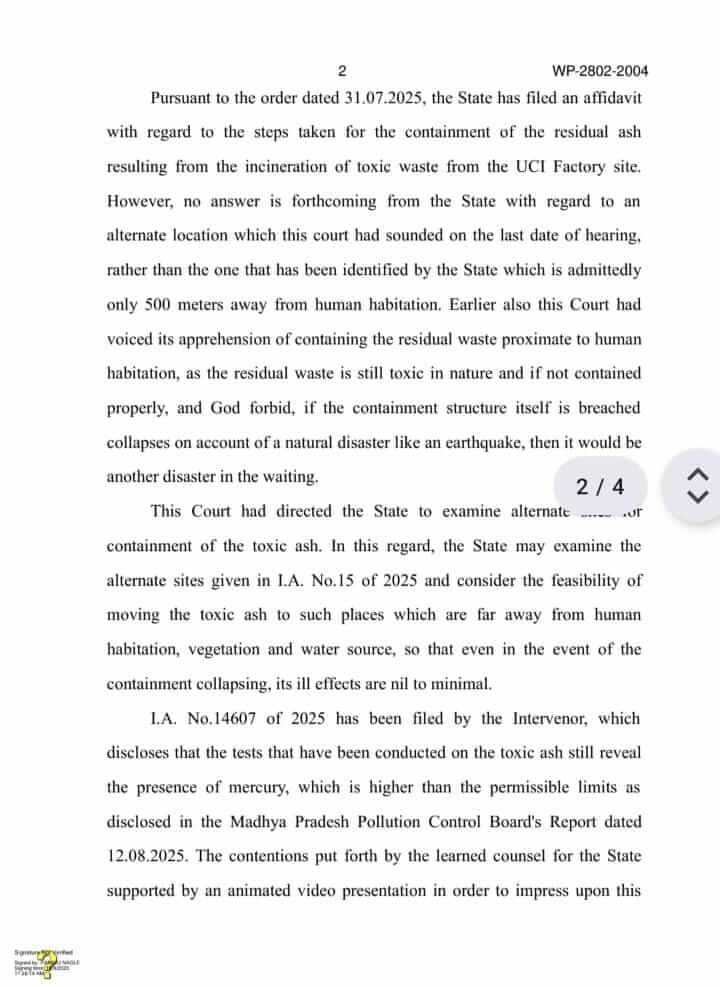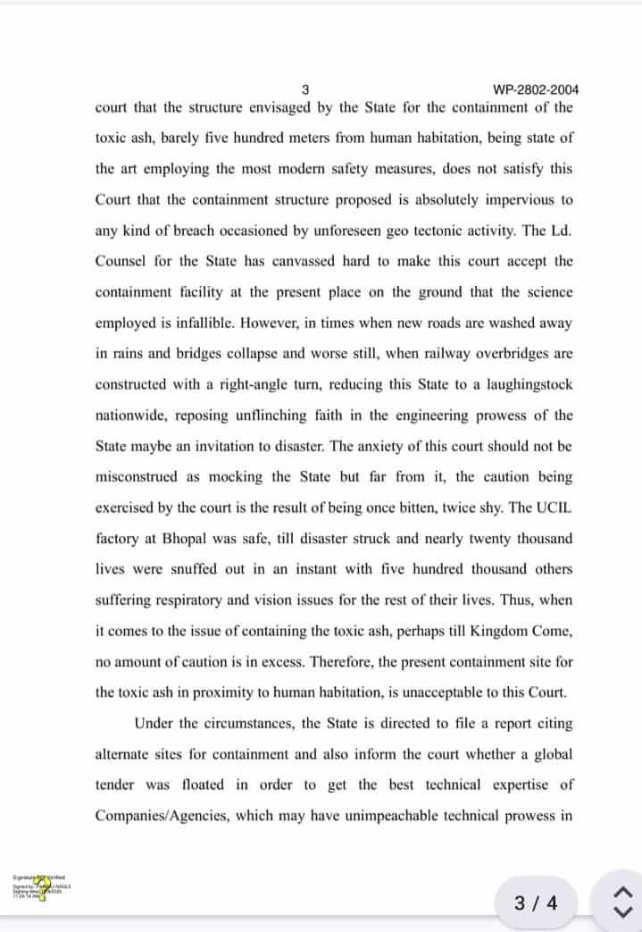 समिति के मुताबिक कोर्ट ने निर्देश दिए हैं कि 899 टन राख को ऐसे स्थान पर ले जाया जाए जहाँ न तो मानव बस्ती हो, न पेड़-पौधे और न ही जलस्रोत। कोर्ट ने सरकार के अब तक उठाए कदमों को अपर्याप्त बताया और वैकल्पिक स्थल की रिपोर्ट माँगी है। साथ ही अंतरराष्ट्रीय विशेषज्ञों की मदद लेने पर भी जवाब तलब किया है।