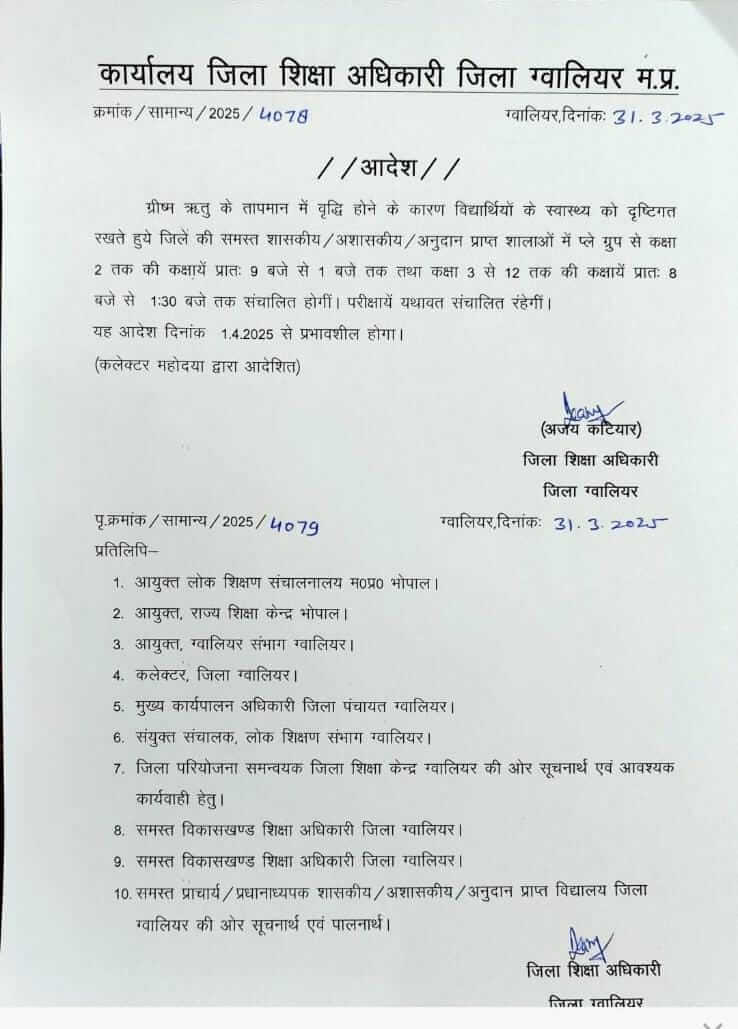 ग्वालियर जिला शिक्षा अधिकारी आदर्श कटियार ने कलेक्टर रुचिका चौहान के अनुमोदन के बाद आदेश जारी किया है कि गर्मी के मौसम को देखते हुए अब से कक्षा नर्सरी से कक्षा 2 तक के स्कूल सुबह 9 बजे से दोपहर 1 बजे तक और कक्षा 3 से कक्षा 12 तक के स्कूल सुबह 8 बजे से 1:30 बजे तक लगेंगे, ये आदेश 1 अप्रैल से प्रभावी होगा।