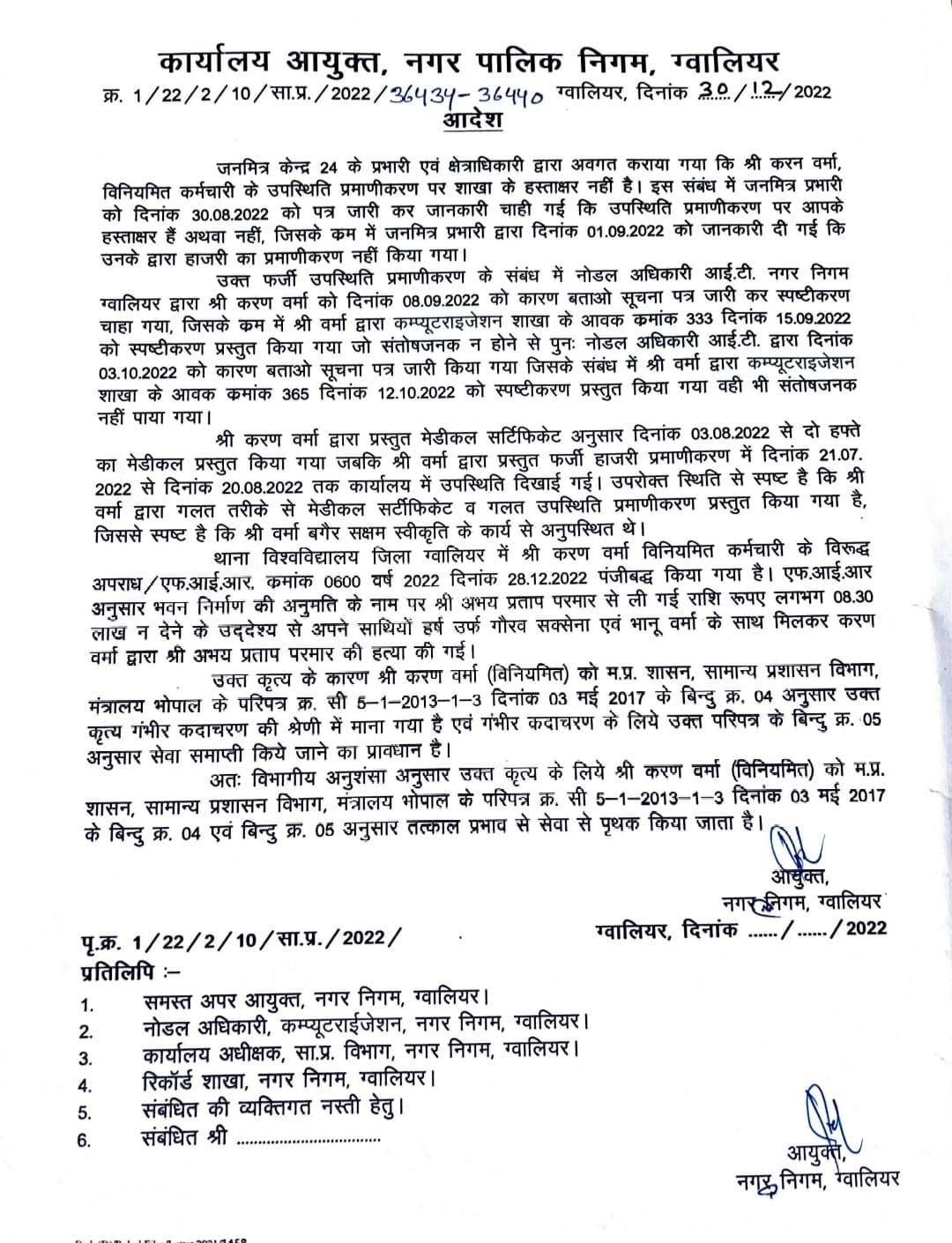 Gwalior News : ग्वालियर नगर निगम कमिश्नर ने आज दो कर्मचारियों के खिलाफ कड़ा निर्णय लिया है। कमिश्नर ने हत्या के आरोपी करण वर्मा की सेवाएं समाप्त कर दी वहीं लोकायुक्त के छापे में रिश्वत लेते पकड़े गए टीसी गोपाल सक्सेना को निलंबित कर दिया है।