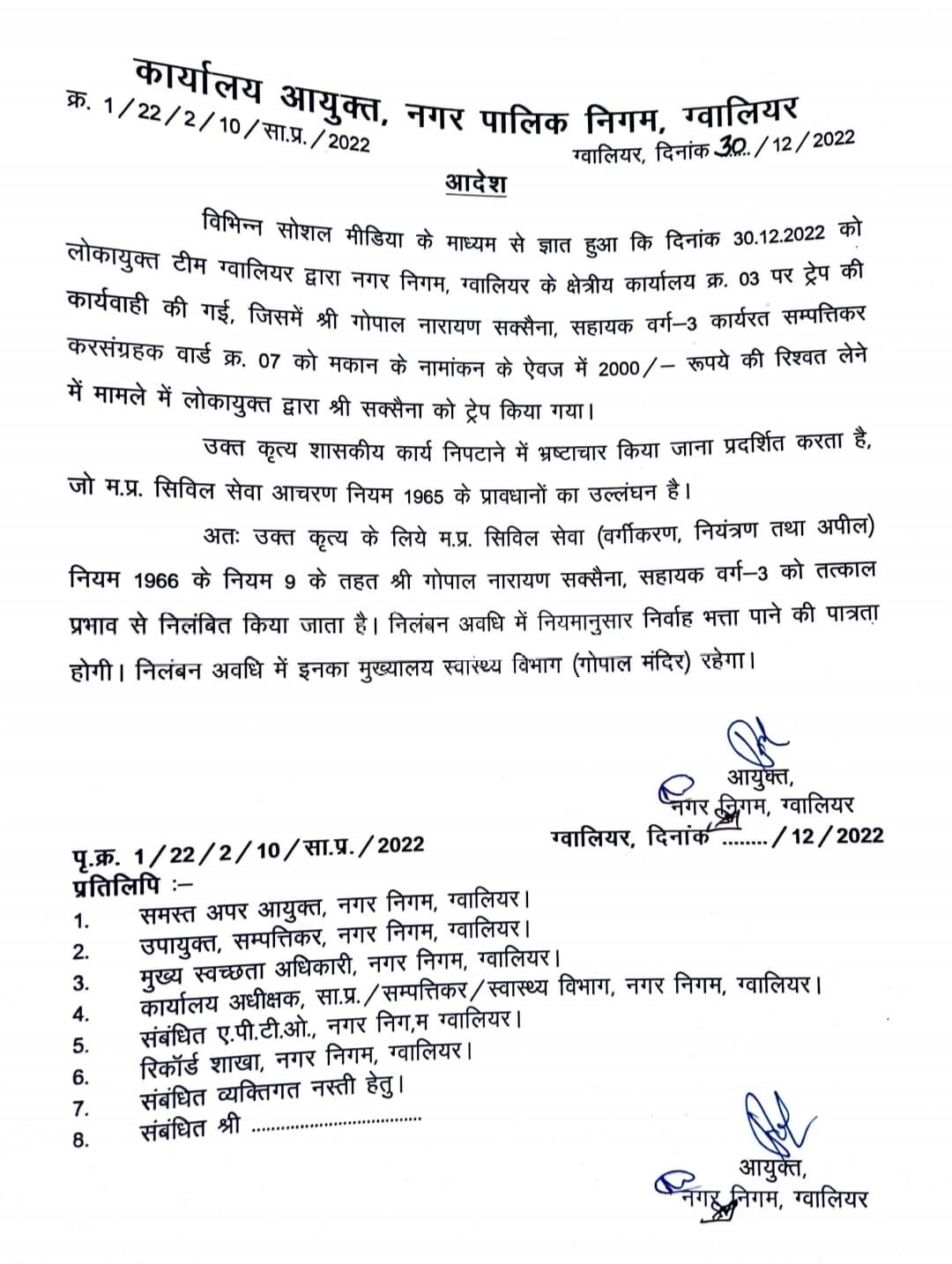 इसके अलावा आज शुक्रवार को ग्वालियर लोकायुक्त पुलिस ने जनमित्र केंद्र क्रमांक 3 लूटपुरा में पदस्थ संपत्ति कर संग्रहक (टीसी) गोपाल सक्सेना को 2000 रुपये की रिश्वत लेते हुए रंगे हाथ गिरफ्तार किया, टीसी गोपाल श्रीवास्तव रिटायर्ड डीएसपी भगवान दास पन्त से उनके मकान का नामांतरण करने के बदले 2000 रुपये की रिश्वत ले रहा था, लोकायुक्त द्वारा ट्रैप किये जाने के चलते नगर निगम कमिश्नर ने गोपाल सक्सेना को निलंबित कर दिया है।