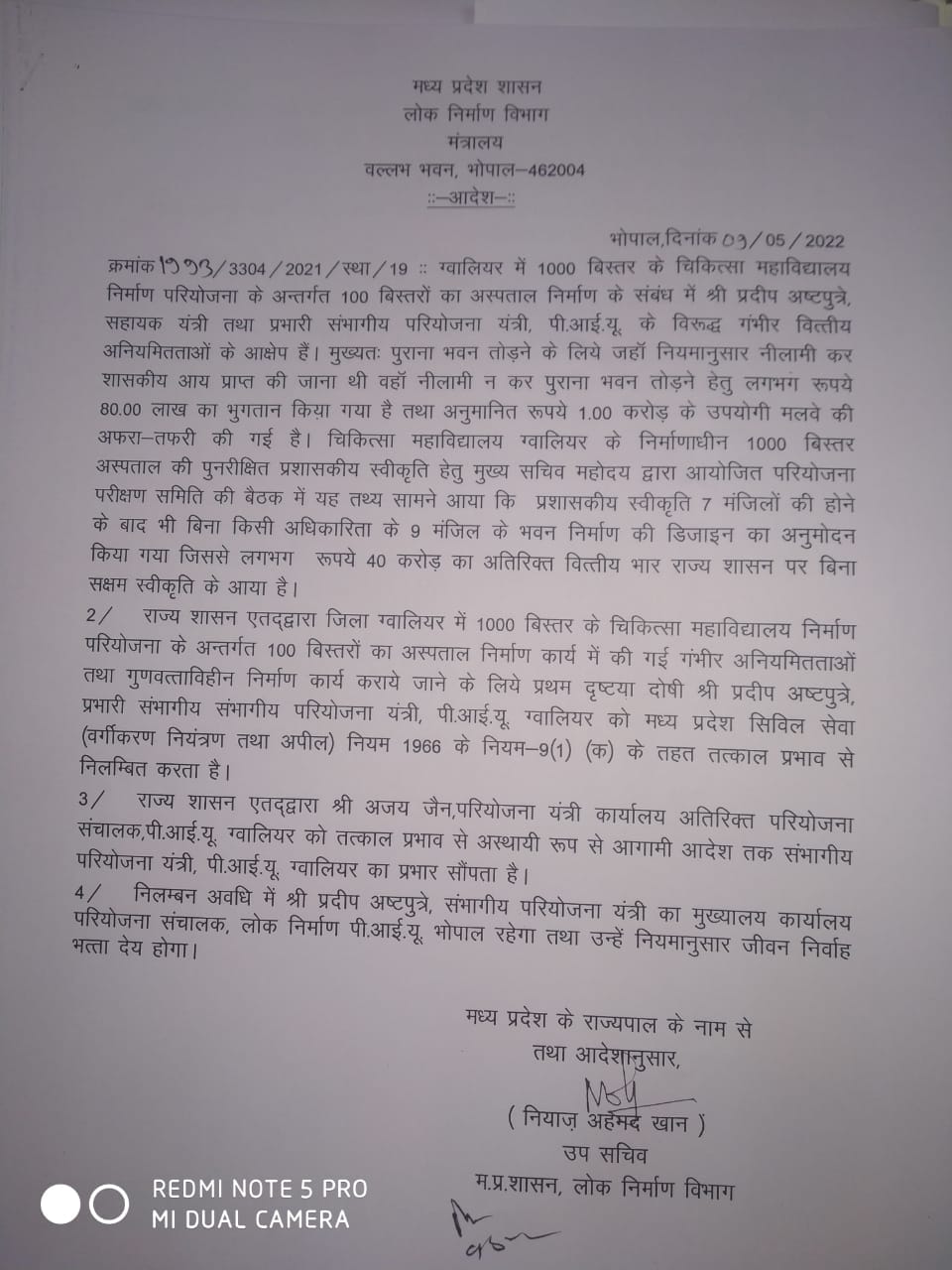 उधर मंत्री विश्वास सारंग भोपाल पहुंचे इधर सोमवार की शाम होते होते प्रदीप अष्टपुत्रे का निलंबन आदेश शासन ने जारी कर दिया। चर्चा है कि ये मंत्री जी की नाराजगी का ही असर है। हालाँकि निलंबन आदेश में पीआईयू के सहायक यंत्री एवं प्रभारी संभागीय परियोजना अधिकारी प्रदीप अष्टपुत्रे पर गंभीर अनियमितता के आरोप लगाए गए हैं।