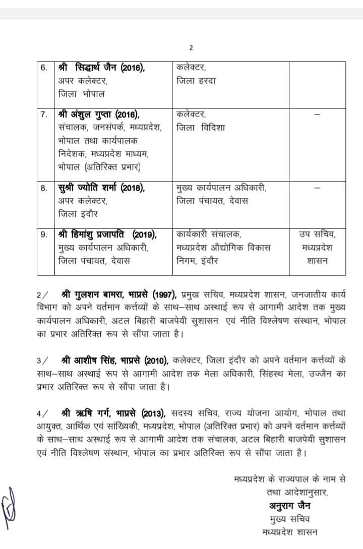- सुभाष कुमार द्विवेदी – कलेक्टर, अशोकनगर से अपर सचिव, सामान्य प्रशासन विभाग।