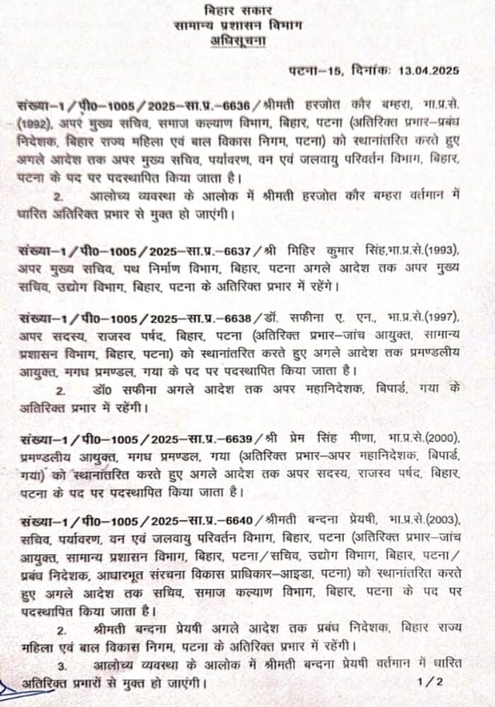 इसके अलावा बिहार की नीतीश सरकार ने भी रविवार को 6 वरिष्ठ आईएएस अधिकारियों का तबादला किया है। इनमें से कुछ अधिकारियों को प्रभार भी दिया गया है तो कुछ को प्रभार से मुक्त किया गया है। ट्रांसफर किये गए अधिकारियों की सूची में हरजोत कौर बम्हरा और मिहिर कुमार सिंह भी शामिल हैं। सामान्य प्रशासन विभाग ने इसकी अधिसूचना जारी कर दी है।