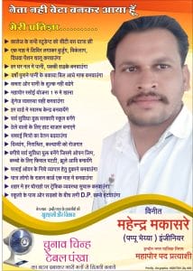 निगम चुनाव में महापौर पद के निर्दलीय उम्मीदवार महेंद्र मकासरे ने बताया कि शासकीय सेवा के दौरान उन्होंने हमेशा पूरी निष्ठा और ईमानदार छवि से काम किया है। लेकिन माँ का सपना है कि इसी ईमानदार छवि के साथ मैं जन सेवा का काम करूँ। जिसके लिए मैंने अपने शासकीय पद को त्याग कर जनसेवा के लिए चुनाव में अपनी दावेदारी पेश की है ताकि चुनाव जीत कर सभी शहरवासियों कि सेवा कर संकू।