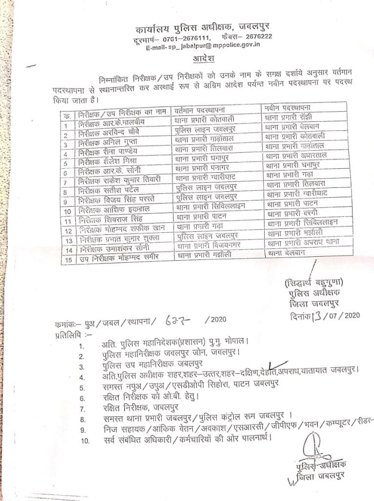 जबलपुर एसपी सिद्धार्थ बहुगुणा ने एक दर्जन से ज्यादा थाने के प्रभारियों में फेरबदल किया है। 15 थाना प्रभारियों को इधर से उधर किया गया ।कोतवाली थाना प्रभारी राजेश मालवीय को हटाकर रांझी भेजा गया है। माढ़ोताल थाना प्रभारी अनिल गुप्ता को कोतवाली का प्रभार मिला है।राकेश तिवारी को ग्वारीघाट से हटा कर गढ़ा थाना भेजा गया है। रीना पांडे तिलवाराघाट थाना से माढ़ोताल थाना पहुँची। उमाशंकर सोनी विजयनगर थाना से अपराध थाना और उप निरीक्षक मोहम्मद समीर मंझौली से बेलबाग पहुंच गए है।
