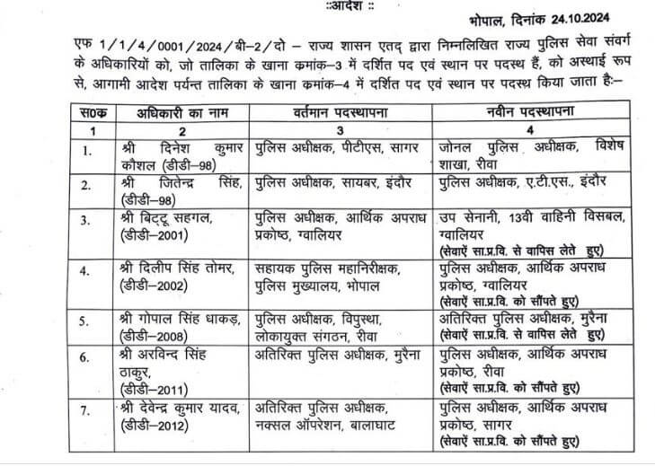 - दिनेश कुमार कौशल को सागर जिले के पीटीएस एसपी पद से हटाकर रीवा की विशेष शाखा के जोनल पुलिस अधीक्षक।