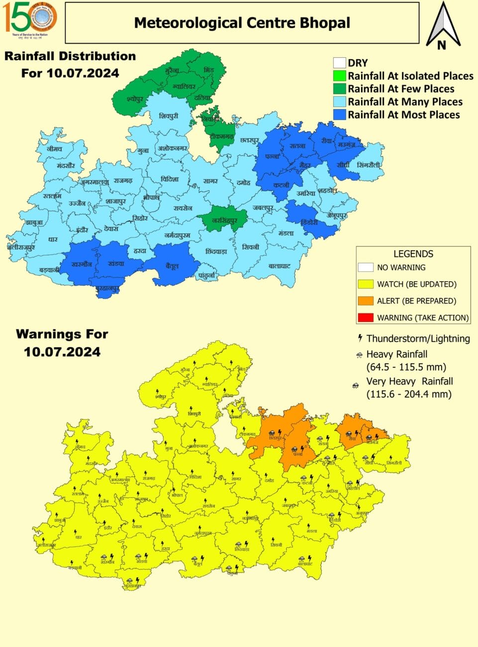 एमपी मौसम विभाग ने श्योपुर, गुना, शिवपुरी, राजगढ़, शाजापुर, खरगोन, खंडवा, बुरहानपुर, निवाड़ी, टीकमगढ़, सागर, छिंदवाड़ा, पांढुर्णा, सिवनी, मंडला, बालाघाट, अनूपपुर सहित कई जिलों में बारिश का अलर्ट जारी किया है। इसमें बड़वानी, खरगोन और झाबुआ में भारी वर्षा/बिजली गिरने और अलीराजपुर, खंडवा, बुरहानपुर में मध्यम गरज के साथ बौछारें की संभावना है। धार/मांडू, बैतूल, महेश्वर, मुरैना, श्योपुर कलां, पंढुर्ना और पूर्वी विदिशा में हल्की गरज के साथ बौछारें पड़ने की संभावना है।