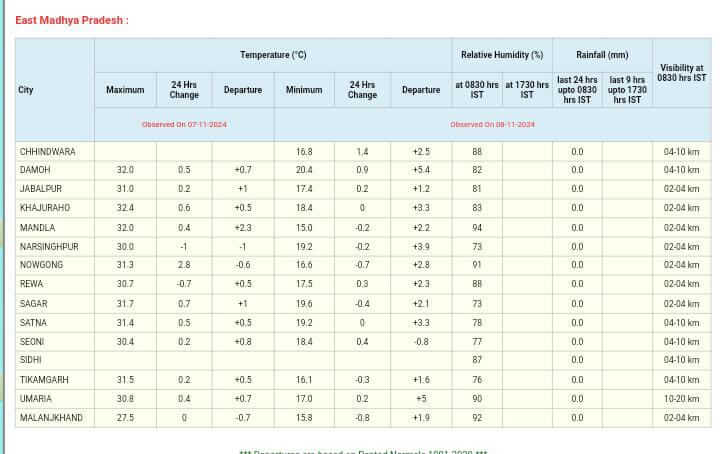 एमपी मौसम विभाग की मानें तो वर्तमान में प्रदेश में कोई बड़ा मौसम सिस्टम प्रभावी नहीं है, हालांकि हवाओं का रुख उत्तरी होने के कारण तापमान में गिरावट आने लगी है।अगले 24 घंटों के दौरान प्रदेश में मौसम शुष्क रहने के आसार है। तापमान में और गिरावट की संभावना है, और प्रदेश के अन्य हिस्सों में भी रात का तापमान और नीचे गिर सकता है।