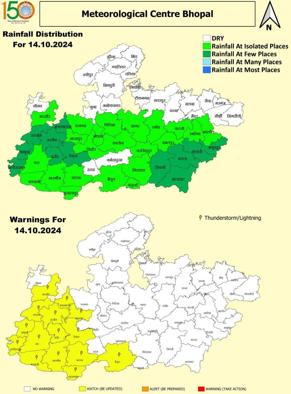 रविवार को कई जिलों में बारिश हुई और आज सोमवार को भी इंदौर-उज्जैन संभाग में बारिश की चेतावनी जारी की गई है।खंडवा, खरगोन, बुरहानपुर, बड़वानी, हरदा, देवास, इंदौर, धार, अलीराजपुर, नीमच में बिजली चमकने के साथ हल्की आंधी जारी रहने की संभावना है। ठंडी हवा से तापमान में गिरावट देखने को मिलेगी। संभवत: सामान्य से दो से तीन डिग्री तापमान नीचे रहेगा। 16 से 18 अक्टूबर के बीच बारिश की स्थिति कमजोर हो सकती है।
