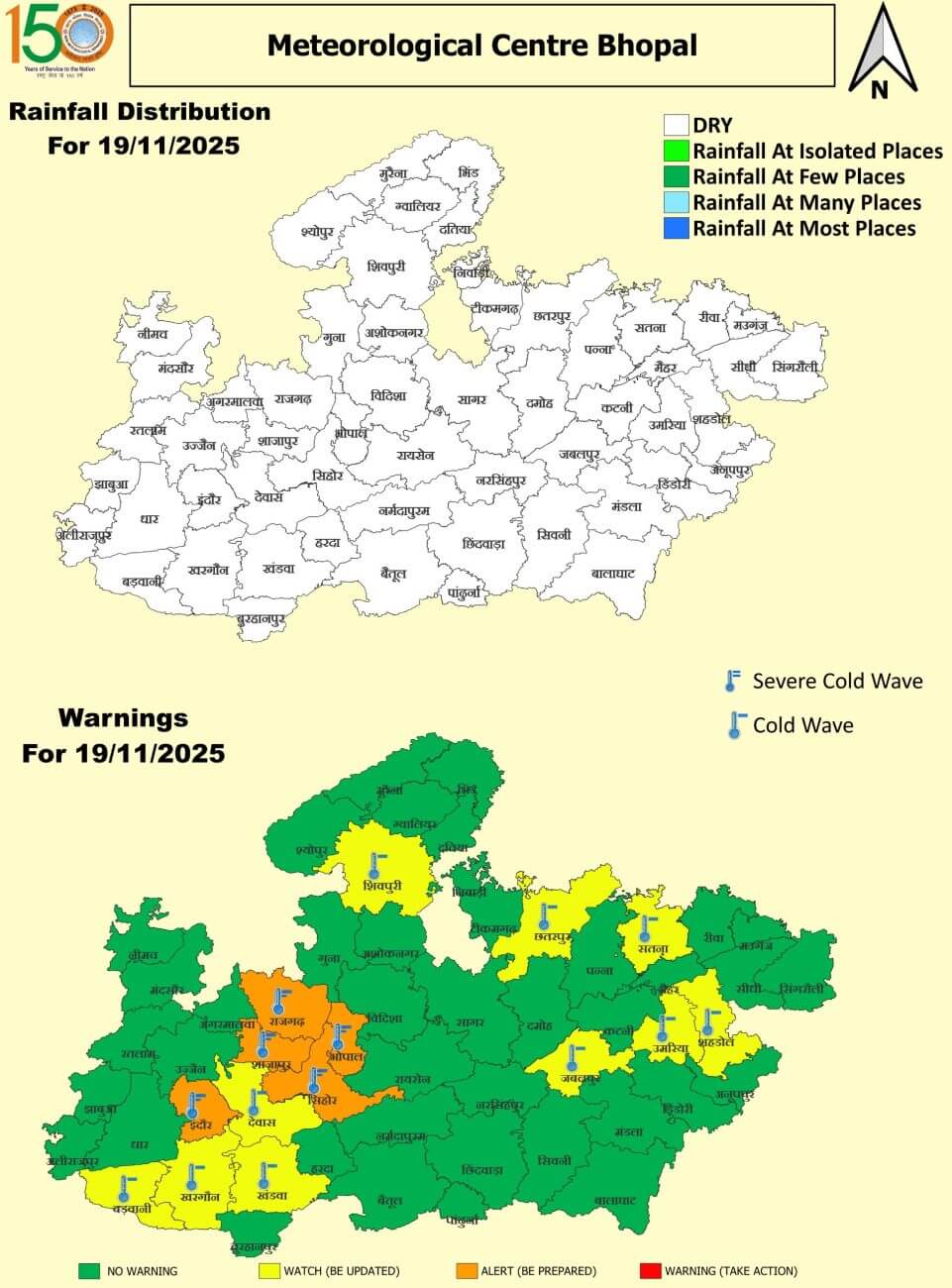 MP Weather Forecast : मध्य प्रदेश में ठंड से थोड़ी राहत मिलने वाली है। आज से मौसम में फिर बदलाव आने वाला है जिससे तापमान में वृद्धि होगी और शीतलहर का असर कम होगा ।बुधवार को 1 दर्जन से ज्यादा जिलों में शीतलहर का अलर्ट जारी किया गया है।इधर, 22 नवंबर से दक्षिण-पूर्वी खाड़ी में एक लो प्रेशर एरिया सक्रिय होने जा रहा है।मंगलवार को राजगढ़ सबसे ठंडा दर्ज किया गया। यहां पारा 6.5 डिग्री दर्ज किया गया।