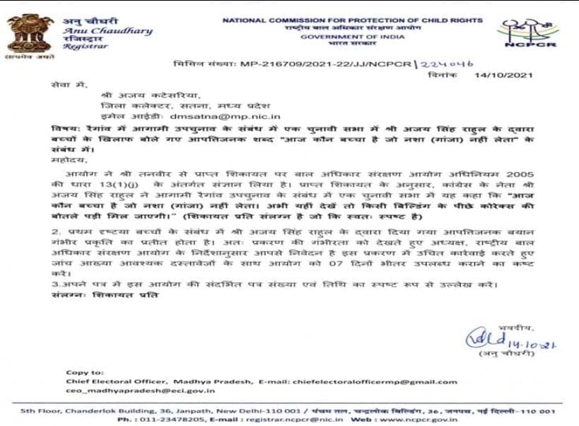 दरअसल मध्य प्रदेश के रैगांव उपचुनाव में प्रचार के दौरान अजय सिंह ने एक चुनावी सभा में आर्यन खान के बचाव में कहा था कि ”फिल्म स्टार के बेटे आर्यन खान के पास कुछ नहीं मिला, कोई सबूत नहीं मिला कि उसने गांजा लिया यानहीं। इसके बावजूद उसे आज तक जमानत नहीं मिली है। कोई कानून नहीं है कि किसी को अरेस्ट कर लें और उसे बिना जमानत के रखें। बघेली भाषा में बोलते हुए राहुल यह भी कह गए कि आज कौन बच्चा है जो नशा नहीं लेता। अभी यहीं देखें तो किसी बिल्डिंग के पीछे कोरेक्स की बोतलें पड़ी मिल जाएंगी। ”राहुल के इस बयान ने क्षेत्र में खलबली मचा दी है, उनके इसी बयान पर राष्ट्रीय बाल संरक्षण आयोग ने नोटिस भेजा है।