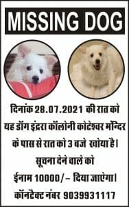 दरअसल सफेद रंग के पॉमेरियन डॉग की एक पोस्ट इस समय सोशल मीडिया पर वायरल हो रही है। पोस्ट में लिखा है – Missing Dog , ये डॉग इंद्रा कॉलोनी कोटेश्वर मंदिर के पास से रात को तीन बजे खोया है, सूचना देने वाले को 10,000 रुपये इनाम दिया जाएगा , आखिर में कॉन्टेक्ट नंबर भी लिखा गया है। सोशल मीडिया पर वायरल हो रही ये पोस्ट डॉग और उसके मालिकों के प्रेम को दर्शा रही है।