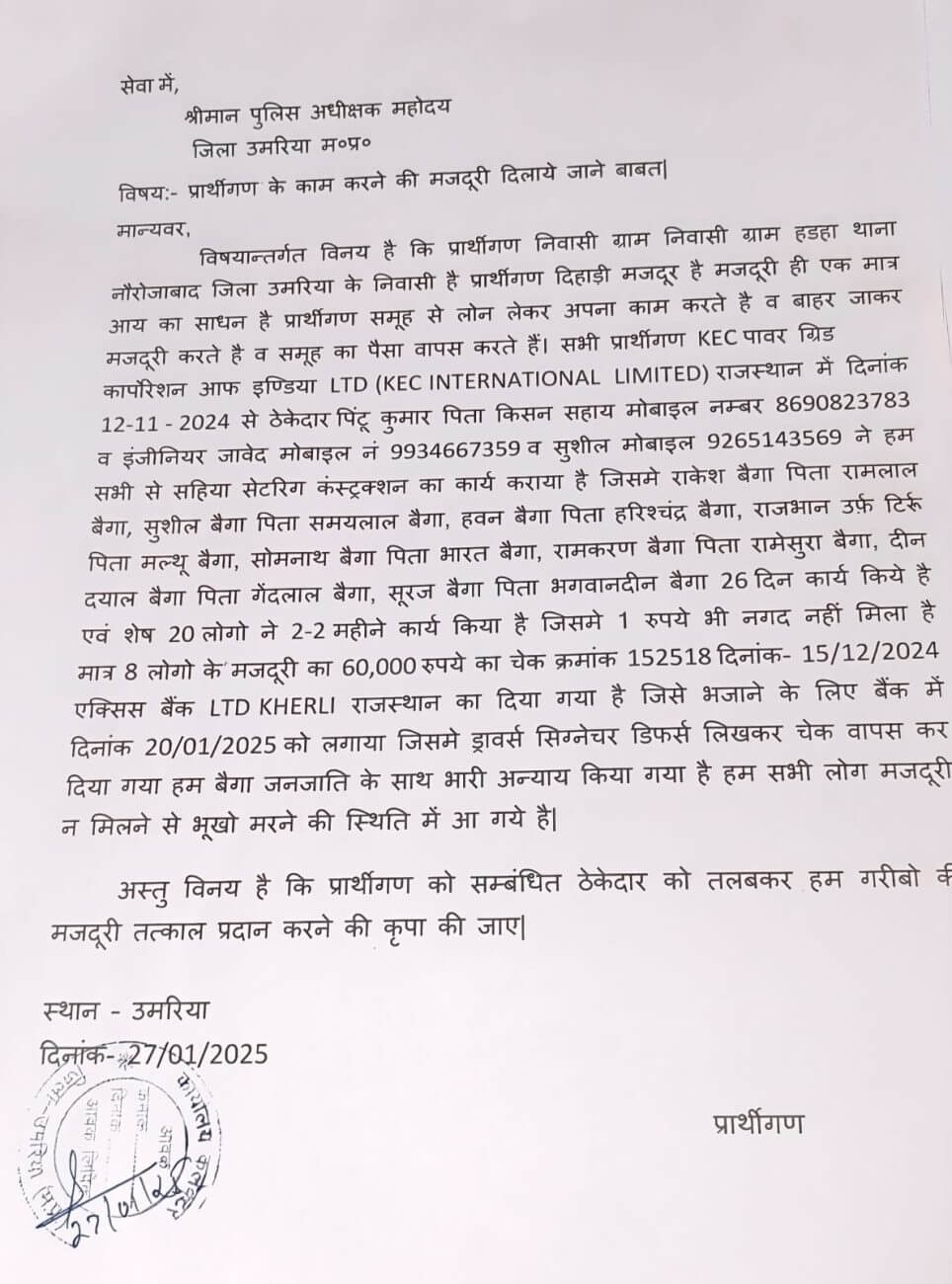 Umaria News : मध्य प्रदेश के उमरिया जिले से बड़ी खबर सामने आई है, जब 28 आदिवासी युवक बेरोजगारी से जूझते हुए रोजगार की तलाश में राजस्थान के जैसलमेर जिले के ग्राम रामगढ़ पहुंचे थे। इन युवकों ने वहां केईसी पावर ग्रिड कॉरपोरेशन ऑफ इंडिया इंटरनेशनल लिमिटेड में ठेकेदार के तहत लगभग ढाई महीने तक मेहनत की, लेकिन काम खत्म होने के बाद ठेकेदार ने उन्हें मजदूरी के नाम पर ₹60,000 का एक चेक थमा दिया और उन्हें काम से अलग कर दिया।
