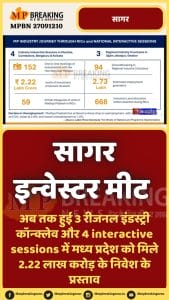 बता दें कि मध्य प्रदेश में अब तक हुए 3 रीजनल इंडस्ट्री कॉन्क्लेव और 4 इंडस्ट्री इंटरएक्टिव सेशंस के दौरान 2.22 लाख करोड़ रुपये के निवेश प्रस्ताव मिल चुके हैं, जिसके चलते 2.73 लाख नौकरियों के अवसर पैदा होने की उम्मीद जताई है।