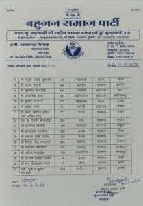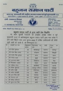 कुमारी मायावती के आदेशानुसार बसपा द्वारा जारी किए गए इस सूची में मुकेश सोनगरा, लीलाराम मालवीय, मुकेश रावत, दशरथ सिंह अंजना, जीवन मालवीय, संतोष प्रसाद साकेत, राम खिलावन, निर्भय सिंह चंद्रवंशी और अन्य प्रत्याशियों के नाम शामिल है।