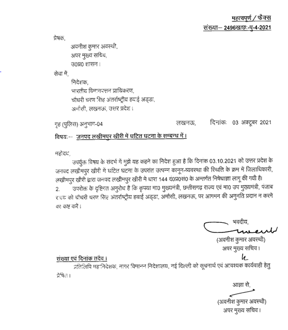 दरअसल, यूपी के अपर मुख्य सचिव अवनीश अवस्थी ने लखनऊ एयरपोर्ट (Lucknow Airport) से छत्तीसगढ़ CM भूपेश बघेल और पंजाब के उपमुख्यमंत्री सुखजिंदर एस.रंधावा (Punjab Deputy Chief Minister Sukhjinder Singh Randhawa) को एयरपोर्ट पर उतरने की इजाजत नहीं देने को कहा।इस संबंध मे एक आदेश भी जारी किया गया है। लखीमपुर खीरी में शनिवार को घटित घटना के बाद भूपेश बघेल और सुखजिंदर एस.रंधावा ने लखीमपुर खीरी जाने की घोषणा की थी।
