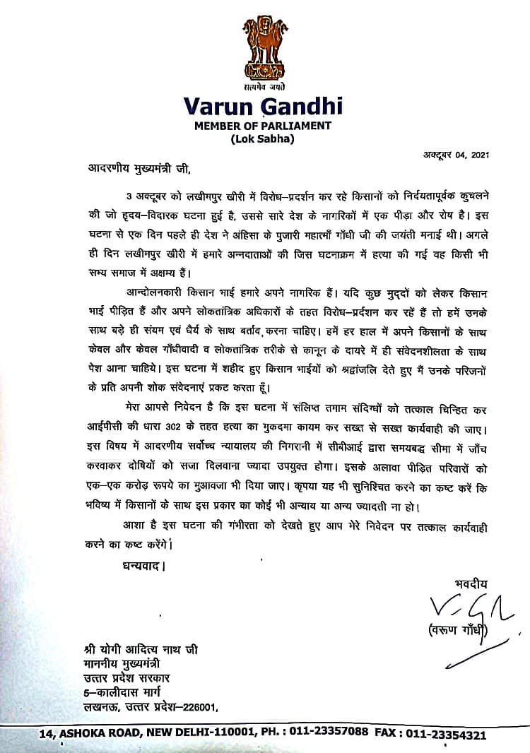 वही भाजपा नेता वरुण गांधी (Varun Gandhi) ने मुख्यमंत्री योगी आदित्यनाथ (Yogi Aditya Nath) को पत्र लिखा है और पूरे मामले में कड़ी कार्रवाई की मांग की है। उन्होंने कहा कि लखीमपुर खीरी की हृदय-विदारक घटना में शहीद हुए किसानों को श्रद्धांजलि अर्पित करता हूँ। इस प्रकरण में उत्तर प्रदेश के मुख्यमंत्री जी से सख्त कार्यवाही करने का निवेदन करता हूँ।