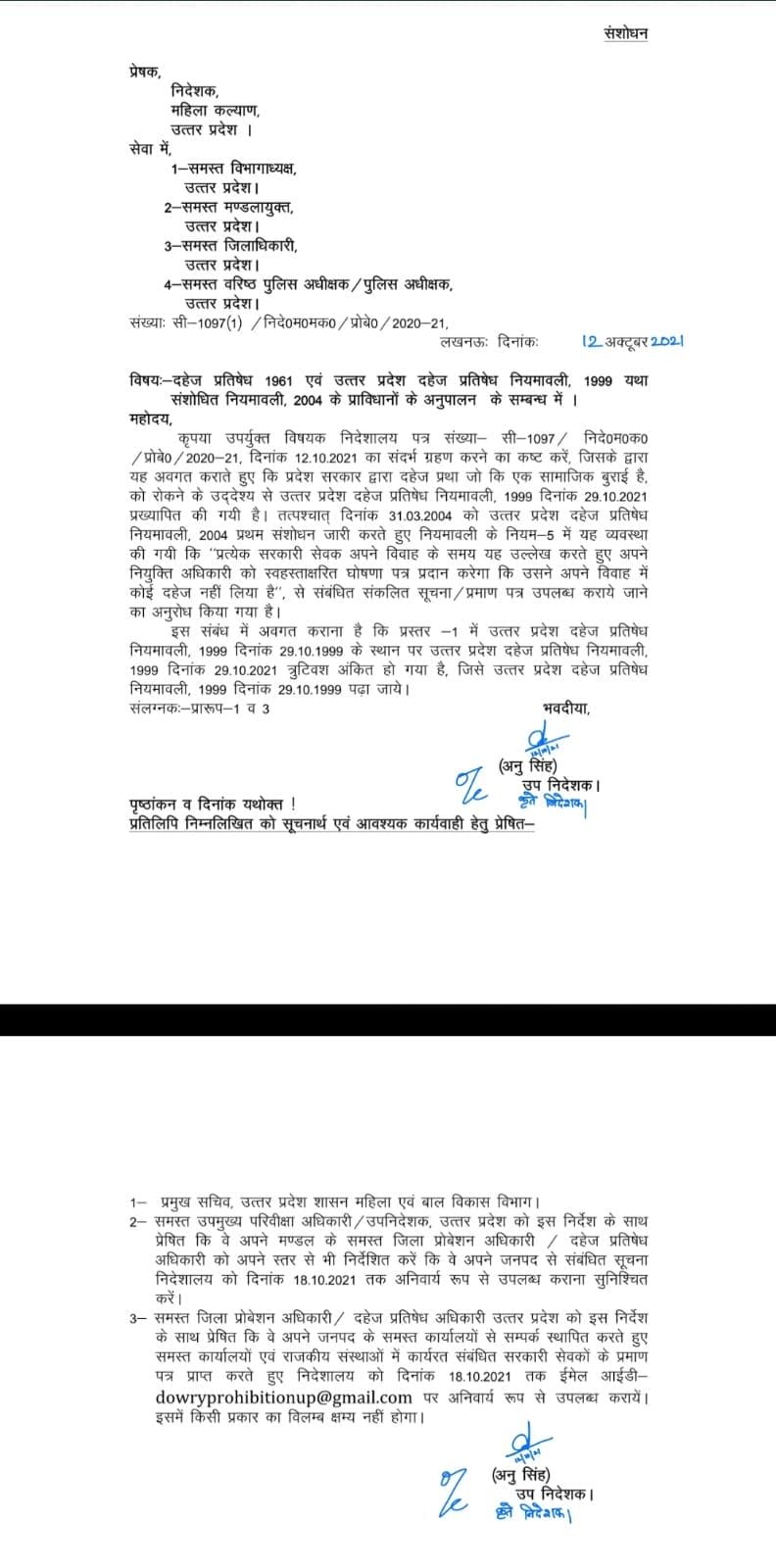 इस संबंध में यूपी महिला कल्याण विभाग (UP Women Welfare Department) ने सभी सरकारी सेवकों को प्रमाण पत्र देने को कहा है। इसके साथ ही सभी विभागों को रिमांडर जारी करते हुए 18 अक्टूबर तक का दिया गया समय।इसमें यह साफ किया गया है कि यदि कोई कर्मचारी दहेज लिया या नहीं के संबंध में घोषणा पत्र नहीं देता है तो उसके विरुद्ध संबंधित विभागाध्यक्ष कार्रवाई करेंगे।