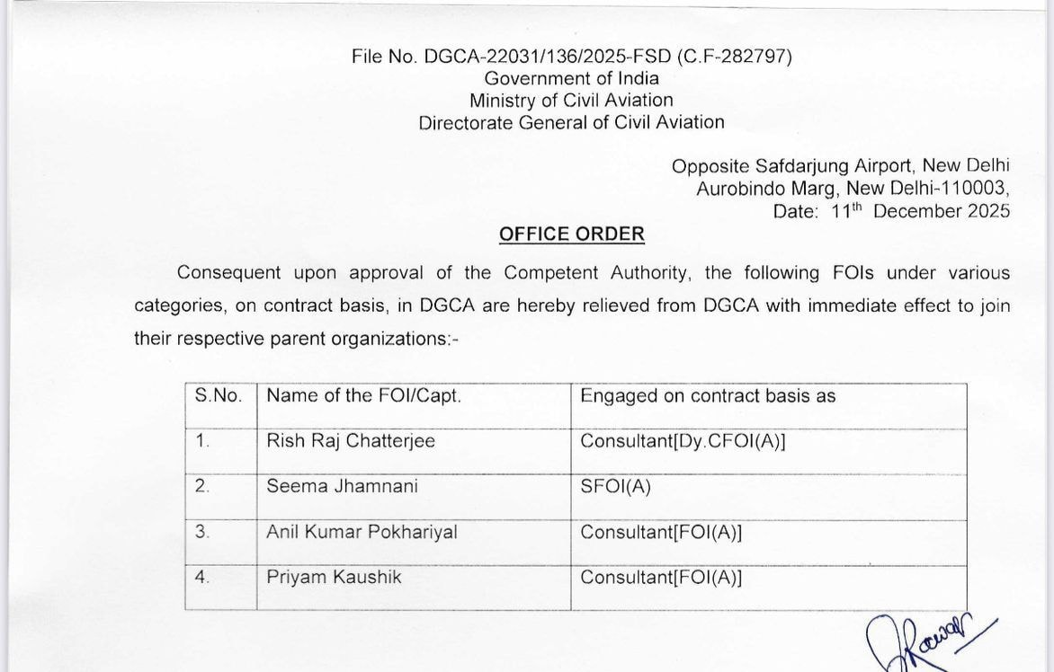 DGCA ने 11 दिसंबर 2025 को अपने आदेश में साफ लिखा कि कॉन्ट्रैक्ट पर नियुक्त चार FOIs को तुरंत उनके पैरेंट ऑर्गनाइजेशन भेजा जा रहा है। जिन अधिकारियों को हटाया गया है, उनके नाम हैं ऋष राज चटर्जी, सीमा झमनानी, अनिल कुमार पोखरियाल और प्रियम कौशिक। ये सभी अधिकारी इंडिगो की फ्लाइट सेफ्टी, क्रू मैनेजमेंट, ऑपरेशनल कंप्लायंस और फ्लाइट शेड्यूलिंग से संबंधित निगरानी का काम देख रहे थे। यानी यह वही टीम थी जिसे इंडिगो ऑपरेशन की हर गतिविधि पर बारीकी से नज़र रखनी थी।