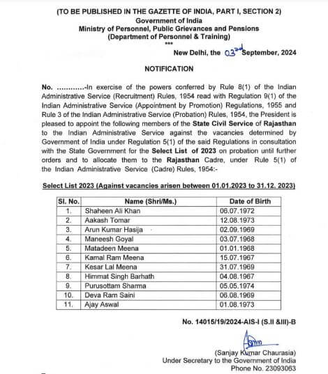 भारतीय प्रशासनिक सेवा (भर्ती) नियम, 1954 के नियम 9(1) के साथ पठित नियम 8(1) द्वारा प्रदत्त शक्तियों का प्रयोग करते हुए सेवा (पदोन्नति द्वारा नियुक्ति) विनियम, 1955 और भारतीय प्रशासनिक सेवा (परिवीक्षा) नियम, 1954 के नियम 3 के अनुसार, राष्ट्रपति राजस्थान राज्य सिविल सेवा के इन अफसरों को निर्धारित रिक्तियों के विरुद्ध भारतीय प्रशासनिक सेवा में नियुक्त किया गया। प्रमोशन के साथ आगामी आदेश तक परिवीक्षा काल में रखा गया है।