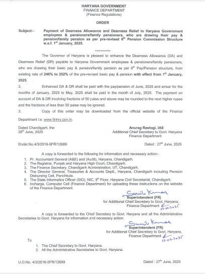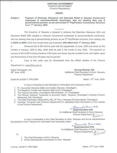 मार्च में केन्द्र सरकार ने केन्द्रीय कर्मचारियों व पेंशनर्स के महंगाई भत्ते में जनवरी 2025 से 2% की वृद्धि की थी जिसके बाद अप्रैल में हरियाणा सरकार ने भी अपने कर्मचारियों पेंशनरों का महंगाई भत्ता 53 फीसदी से बढ़ाकर 55 फीसदी कर दिया था।इसका लाभ 6 लाख से ज्यादा कर्मचारियों पेंशनरों को मिला। अप्रैल 2025 के वेतन और पेंशन के साथ 3 महीनों के बकाया एरियर का भुगतान मई में किया गया ।