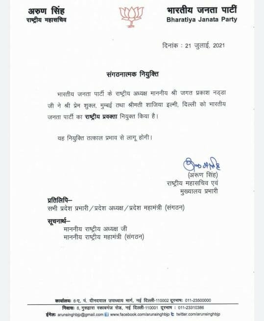 नई दिल्ली, डेस्क रिपोर्ट। मोदी कैबिनेट विस्तार (Modi Cabinet Expansion) के बाद से ही आगामी चुनावों (Assembly Election) को देखते हुए भाजपा (BJP) आए दिन बड़े बदलाव कर रही है। पीयूष गोयल और अब्बास मुख्तार नकवी के बाद भाजपा ने शाजिया इल्मी (Shazia Ilmi)और प्रेम शुक्ला (Prem Shukla) को बड़ी जिम्मेदारी सौंपी है। भाजपा के राष्ट्रीय अध्यक्ष जेपी नड्डा (JP Nadda) ने शाजिया और प्रेम शुक्ला को पार्टी का राष्ट्रीय प्रवक्ता बनाया है।